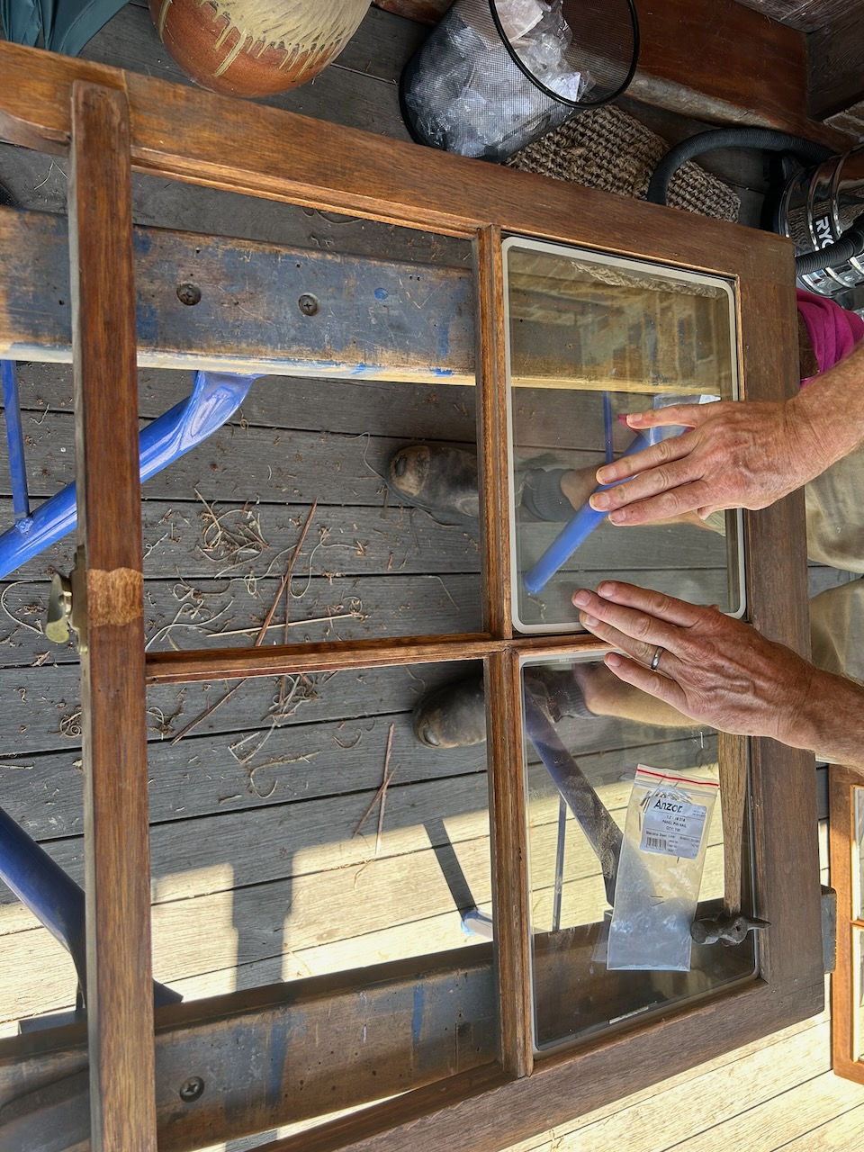 The gap between the two glass panes is only 0.3mm., that is like the thickness of a human hair. The big difference is that the gap is filled with nothing. ABSOLUTELY NOTHING! It’s a vacuum! So its like having a thermos flask in between the glass. These 4mm thick hardened glass panes also have a ‘low-e’ infra-red reflecting coating on the inner sheet facing out. Being only 8.3 mm thick in total. I thought that I could fit them into the old, wooden, double hung, frames that I made 40 years ago, and they could still be lifted up and down in the same runner slots. Or so I thought. As it turned out, they certainly could fit – just. I’m thrilled that it was possible. I paid my friend Andy to help me again, as I didn’t know if it was going to be possible, and time was of the essence, as rain was threatening. Andy is great. He has so much building experience and he adds a sense of calm and professionalism to the situation. He is also younger than me and doesn’t mind working on a scaffold or a ladder. Thank you Andy!