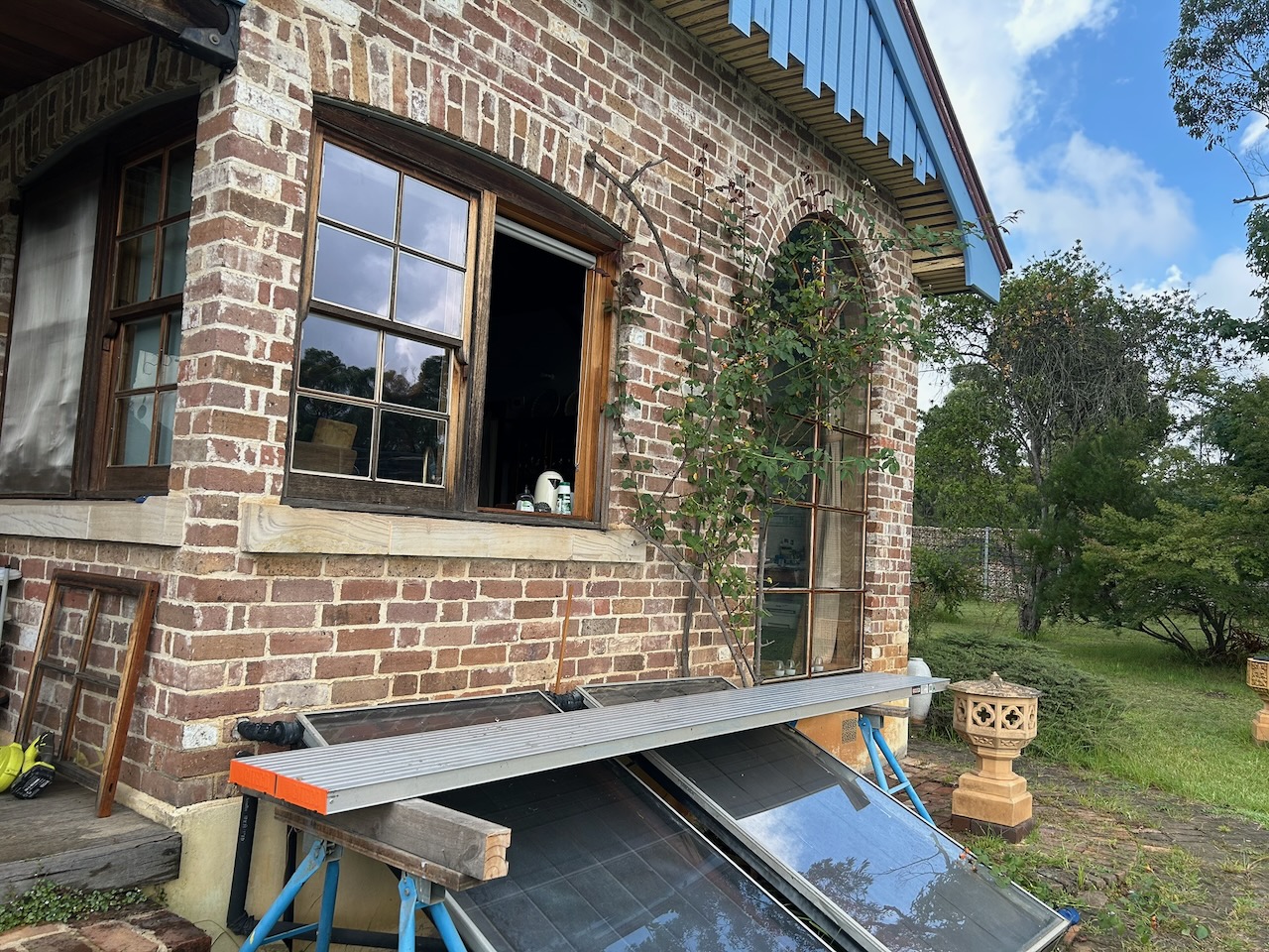 Last year I decided to replace the old single pain 3mm. glass with new argon filled, double glazing. There is now a factory in the local town of Moss Vale that manufactures them. I spent $1800 on 12 new panes of thick double glazed glass. The inner pane has a special metallic ‘low-e’ coating that reflects back the infra red wave lengths of light that used to carry heat into the room. I had to rebuild the old 3 metre high arch window frame glazing bars. I glued and screwed on new 30 mm x 10 mm. extensions to the glazing bars, using some old cedar that I had scrounged many years ago for nothing, sure that it would come in handy for something eventually. These glazing bar extensions made it possible to accommodate the new 20mm. thick double glazed glass units. That was 12 months ago. We really noticed the difference this last hot summer. The kitchen was really cool – without curtains. So different!. That month long, part time exercise of rebuilding the big arch window was spectacularly successful. I managed to do it all in-situ, so there was never a big hole in the wall.  I did rely heavily on my friend Andy, who did the ladder work outside, while I did the inside work. Together, we got it all done in a day.
