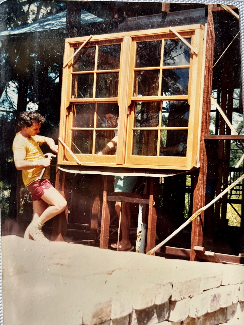I taught myself how to construct a timber frame out of local hard wood supplied by the local Mittagong sawmill. Some of the eucalyptus trees were even felled down in the deep creek gullies behind the village here in Balmoral. We were lucky that Janine’s brother, who was a builder, came to live in Wollongong for a while, about an hours drive away on the coast. He would come up occasionally to help me lay out the footings, or level up and square the frame, then later help me to set the windows that I had made over the 6 months prior. Everything took time, but time was free, we had enough of it if we waited… Paying trades was prohibitively expensive. The only tradesman that we had to employ by law was the electrician. I managed to find a friendly one who let me run all the cables myself, leaving the tufts of wires hanging out where power points and switches were needed. He came back later and did all the connections and testing. Money was the one thing that we didn’t have much of, so we learnt to be frugal. Recycle, repurpose, reuse.