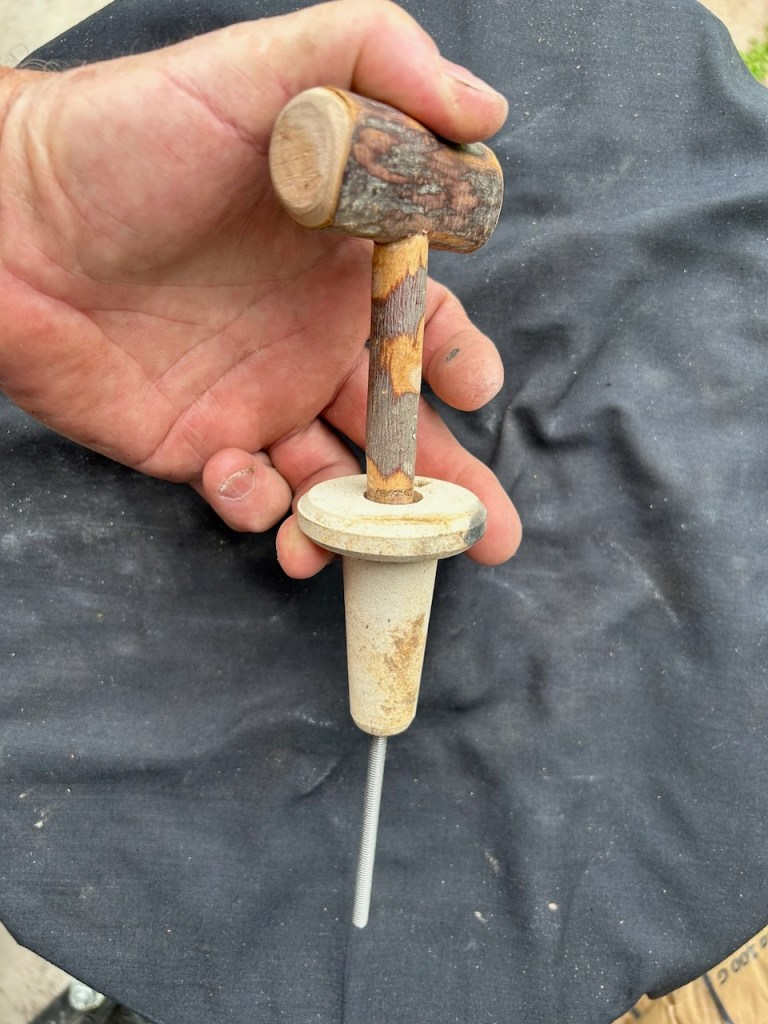 I was lucky that we found a few old re-cycled ceramic anchors in the ashes and rubble after the fire. Janine and our friend Trudie hunted around for them at some point when I was fully occupied doing something else during the chaos. She knew that they had a value and might come in handy in the future. Now 6 years later, they have. Thank you Janine and Trudie ! Some are chipped and have a bit broken from the rim, but still perfectly functional, if used with care.