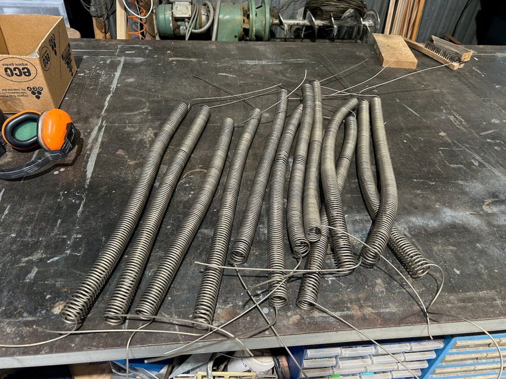 The largest expense in rebuilding an old kiln like this is my labour, so I’m saving a lot of money there. The other big expense is the cost of the bulk Kanthal wire, so that I can wind up a new set of electrical heating elements on the lathe. I have done all the calculations and decided to design the new elements to use the best grade Kanthal A1 resistance wire, and run the whole thing at very low ’watts per sq. millimetre’ rating. This requires using more of the most expensive wire, but gives a set of elements that will last a very long time and make the kiln more or less maintenance free. The wholesale cost to me to purchase the bulk wire is close to $900! Before spending time to wind them on the lathe and form them into hairpin element units.