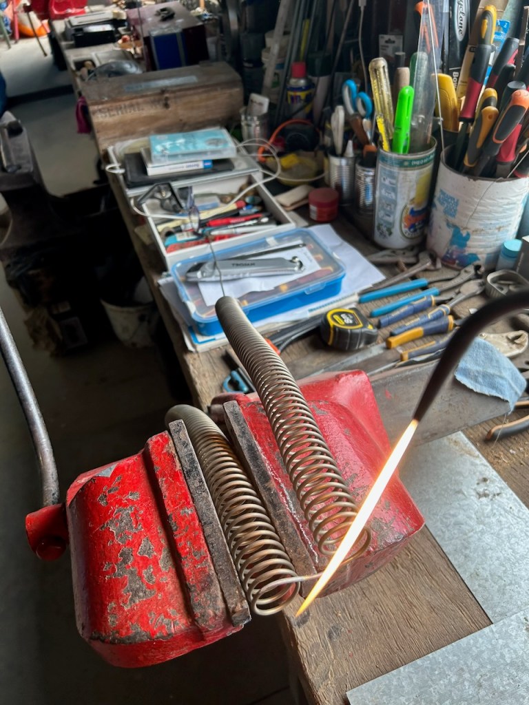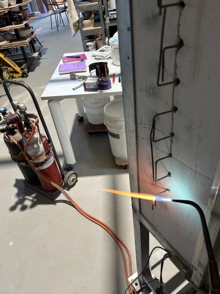 The next job was to renew the door seal, to create a secure tight fit during firing to protect the metal around the door frame. Once that is done I will use the oxy torch to form the heating element coils into ‘hair-pins’, I get them red hot , so that they become pliable, then I can bend them over and double them up into ‘hair-pins’. I can then fit them into the kiln on the ceramic rods, with both terminal ends sticking out the back of the kiln where they can be linked up to make full circuits.