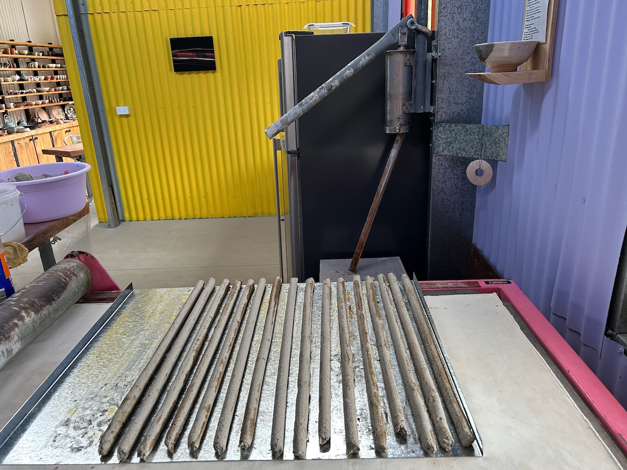 I mixed up a small batch of 10kgs of refractory clay body suitable for use as element rods. I used some old refractory ‘Puggoon’ kaolin, along with 3 sizes of high alumina grog. For years, I used to make all our wadding for the big wood fired kiln out of ‘Puggoon’ high alumina kaolin from Gulgong. I still have one big jute sack of it left in the barn. This special High Alumina wadding (HA) that I made up, after firing to stoneware, wasn’t just rubbish to be thrown out, but instead, I had created very useful, high value, HA grog. Converting what would normally be any one else’s waste product into a valuable asset worth over $6,000 per tonne.