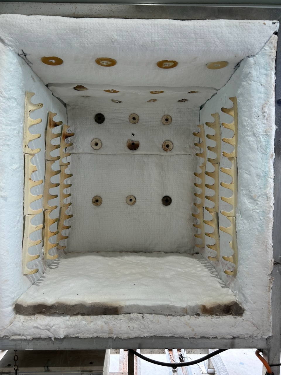 I added another layer of fibre to the floor, but didn’t touch the side walls, as they are intact, and well supported by the element rod support brackets. They will last for a while yet. 3 of the element rod support hooks are broken off. As these where custom made, and are no longer available, rather than go back to basics and make a new set from scratch. I will make 3 small support blocks to hold the rods in-situ in those spots.