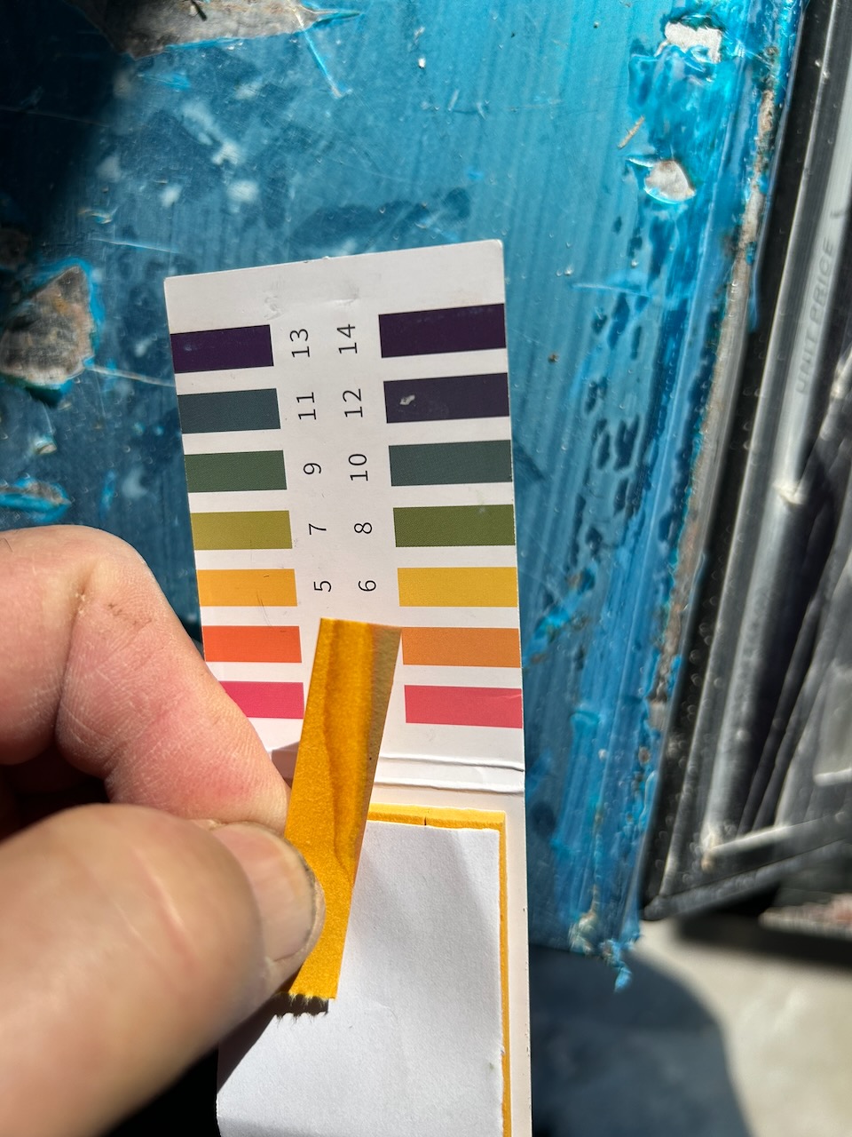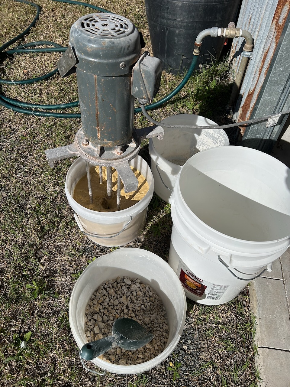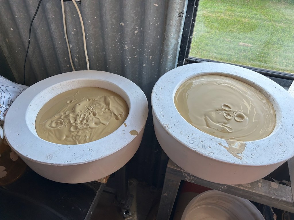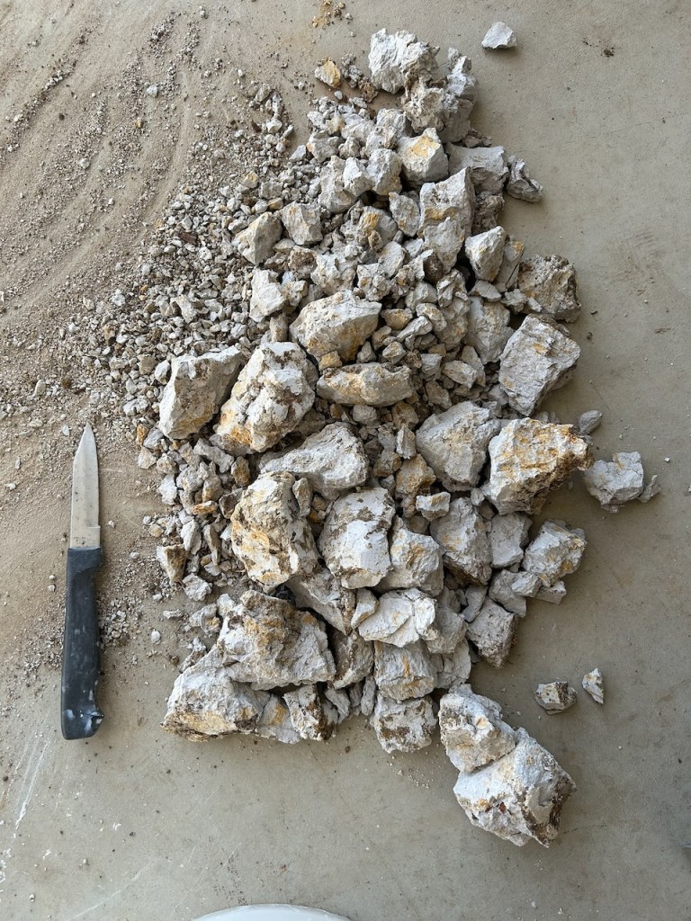 I dried the apparently white clay sample in the sun and then trimmed off all the darker soil and organics with a kitchen knife, so as to get as clean a sample as possible. I crushed the remaining pale clay down to grape size or smaller, then blunged it in water. 7 kgs of clay in 7 litres of water, using a mechanical stirrer. The slip turned out to be a dark yellow colour once all the irony clay particles got dissolved in the water. I sieved the resulting slip through a 40 # mesh sieve, and then again through an 80# mesh fine screen. I left the slip to sit and settle for a few hours, but there was no separation of clay and water, so I tested the pH of the clay slip solution and it was 5.5 pH, slightly acidic. I poured it out onto a plaster bat to stiffen up for testing. Once it is plastic, I will put it through a series of tests to ascertain if it is useful.