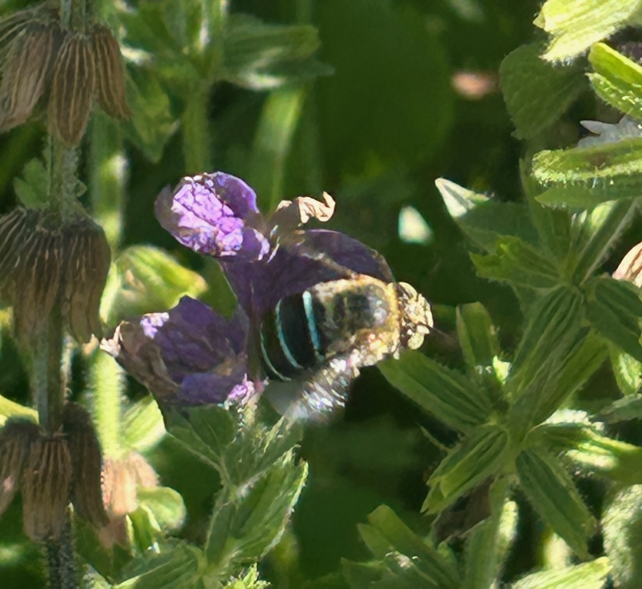 Luckily, for us, we still have European honey bees in our garden. But for how long? I decided to spend a bit of time in the garden and did a bee count. I found that we have about equal numbers of European honey bees and native blue banded bees.