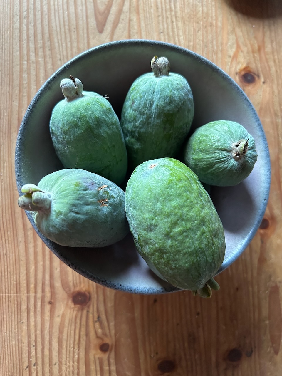 Feijoas likewise, don’t ripen on the tree, but will eventually fall to the ground when they are ready to fall, but not yet ripe enough to eat, as they are still hard and not ripe. They ripen on the ground. We collect them from under the trees and leave them to ripen for a week or two inside the house. When fully ripe, they do have the most amazing taste and fragrance that enriches the kitchen at this time of year. A sort of all-in summer fruit-salad flavour. It is a native of the northern parts of South America, but does well here.