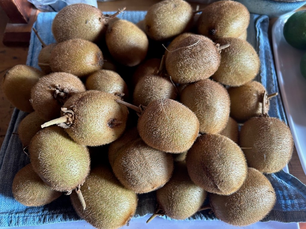 We are also picking Kiwi Fruit. A native plant from central China, possibly more correctly called Chinese Gooseberries. We have hundreds of fruit on the vines this year, it’s our best crop. These plants were all burnt to the ground in the big fire 7 years ago. They had a year under ground recovering, then popped up some suckers and haven’t looked back. The fruit are picked at this time of year, but don’t ripen until about 2 weeks after picking. They don’t ripen on the bush/vine, in the same way as the avocados. We pick and wait. We have to pick them in stages as we need them, but 2 weeks in advance, so there are piles of autumn fruit in various stages of ripening in the kitchen. As these Kiwifruit bushes/vines have re-grown from the root stock. I don’t know what variety they are, but they are lovely, sweet and ever so slightly acidic, just enough to tickle the taste buds. If they get over ripe and soft, they start to become translucent inside, all the romance evaporates, and they become mushy and slightly winey.