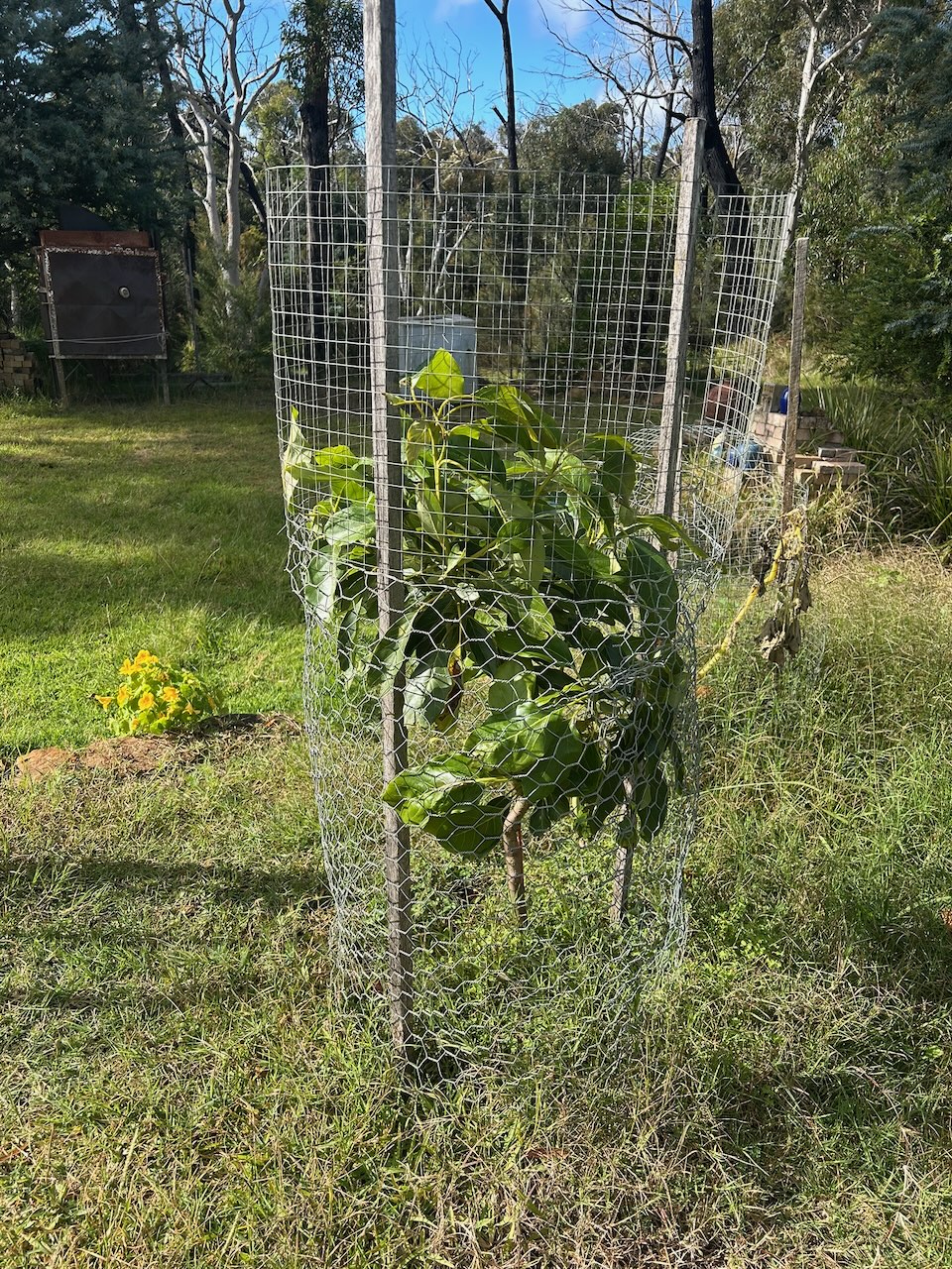 6 years ago, the last time that I planted out some new avocado trees. I thought that I’d put the netting around them the next day as I was a little bit tired out from the digging, planting and watering etc. BIG mistake! The little wallabies stripped the trees bare over night. Never again! I’ve learnt. I know the mantra of ‘No net – no fruit’, but I now have to add to that, No Net – No Tree!