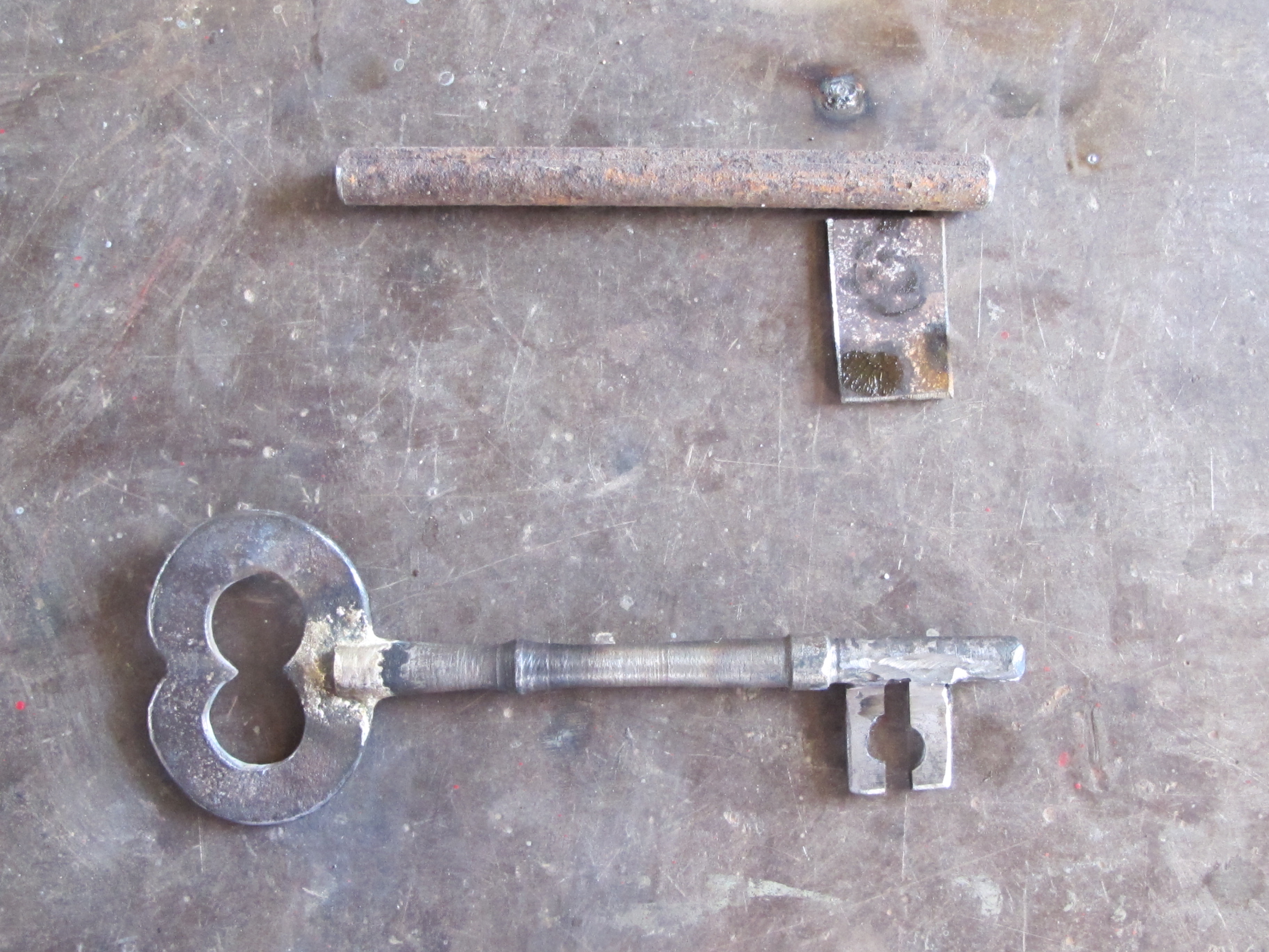 I set to work. Turning an old piece of rusty steel bar on the lathe down to size, and making a little bit of decoration on it along the way. Then I make a clock-work-like hand piece for it out of rusty 3mm. plate and silver solder it on into a groove I cut into the shaft. I use 50% silver/copper solder. It flows into all the cracks easily and polishes up to a nice golden colour when brushed. Then finally I weld on a tang to shift the internals of the lock mechanism out of 3mm plate and TIG weld it, fusing it into the shaft. Lastly I cut, drill and file out the spaces deeded to fit the mechanism exactly. It takes a little time but by the afternoon the lock is back on the door and the new hand made key is a better fit than the last one and will outlast me and the lock.