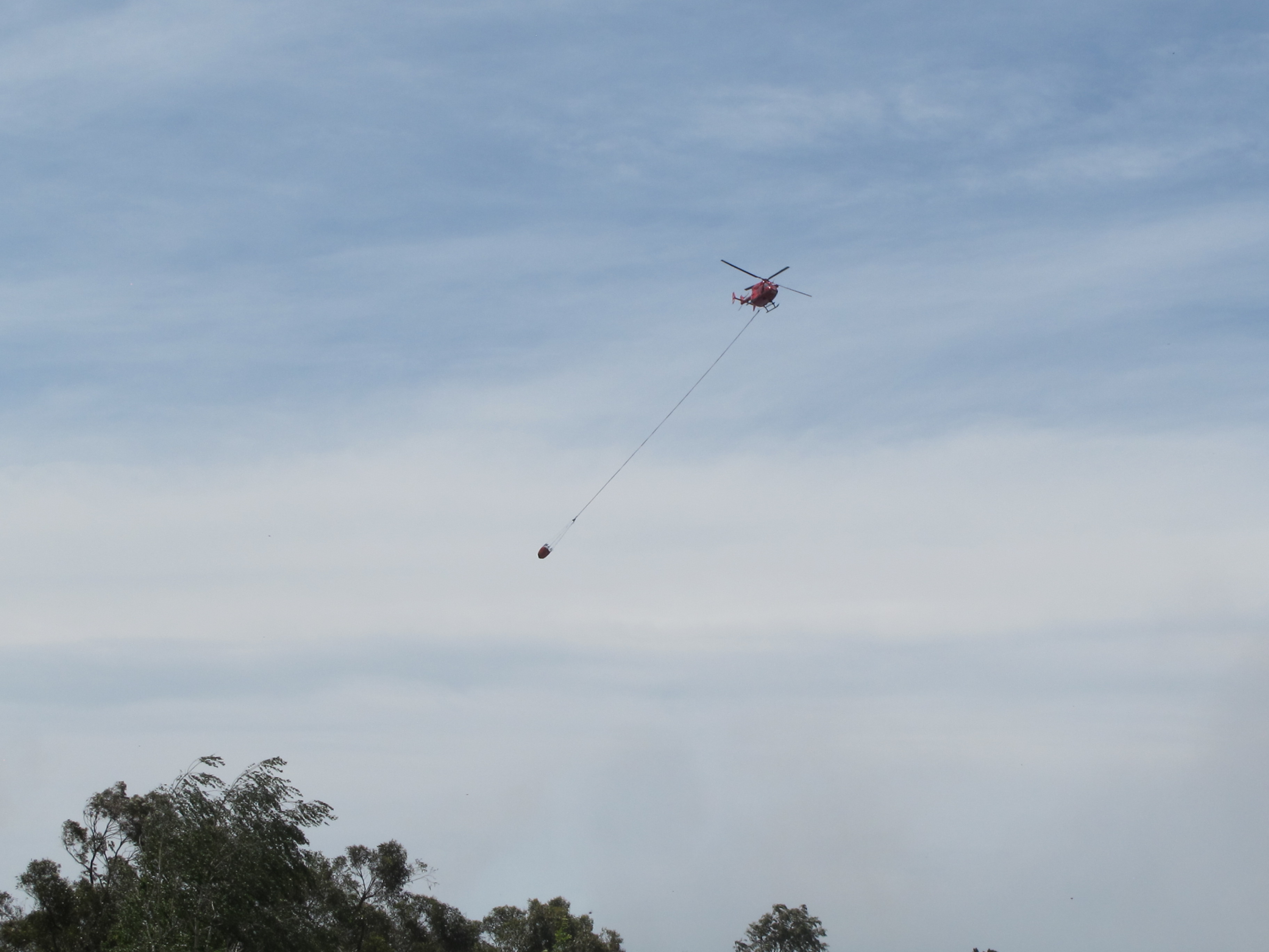 but the other smaller helicopters are still moving about in the area, in the smoke, occasionally flying directly overhead with their water buckets dangling behind.