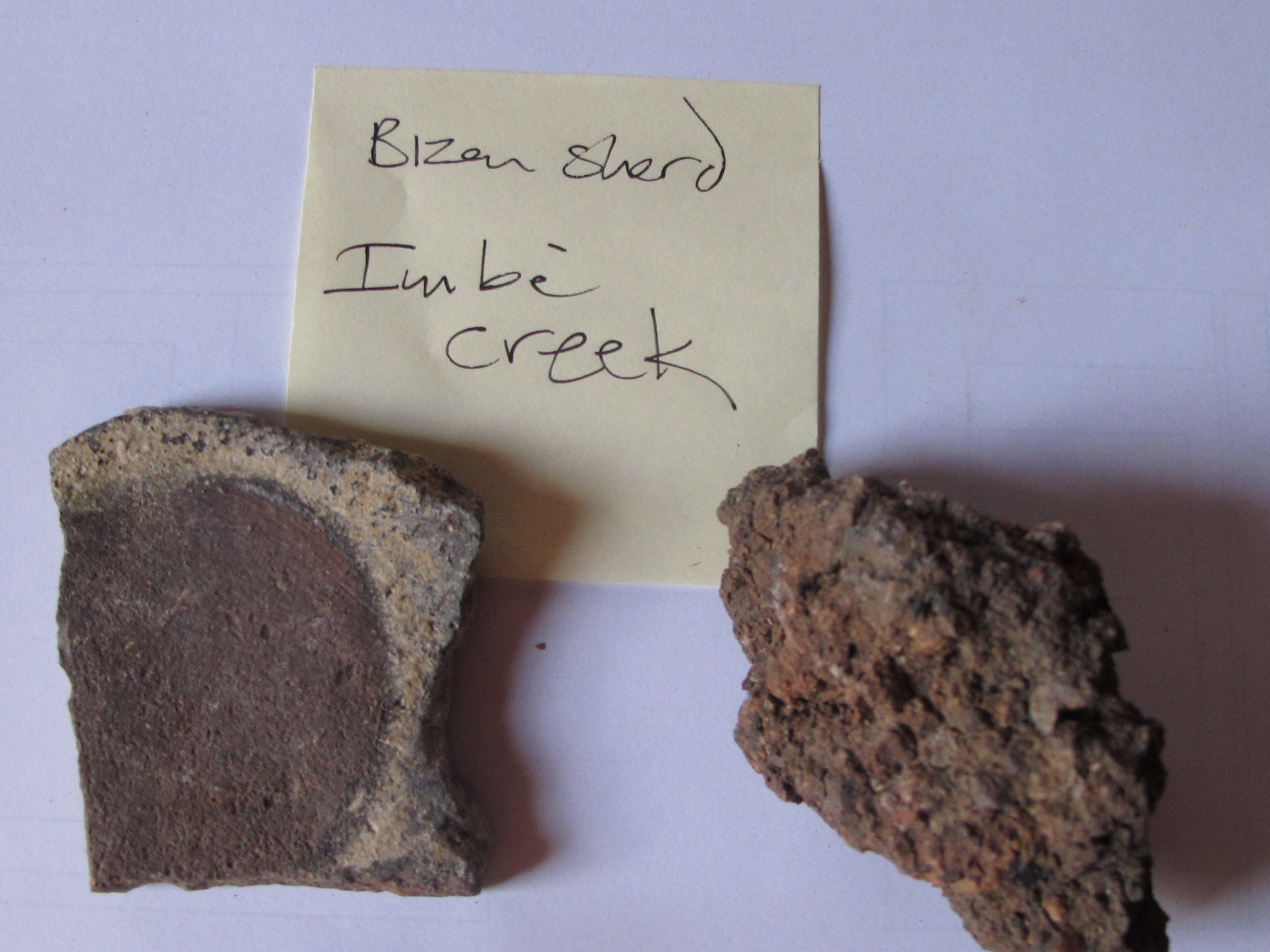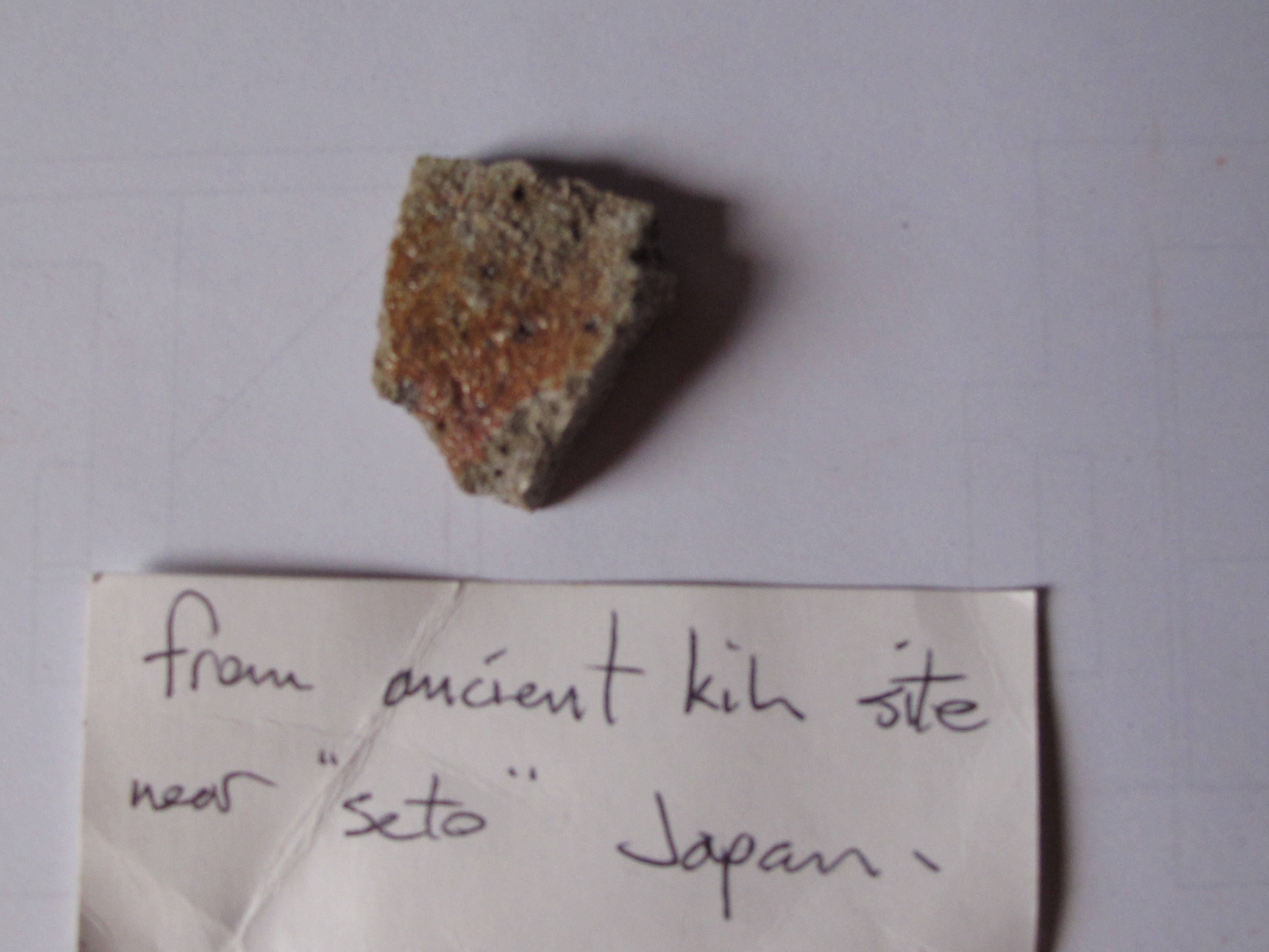 The next sherd that I stole came from a stream near the village of Imbe in Japan in the 80’s. I found some ancient Bizen sherds that had washed down the hill from an old ceramic site somewhere up in the hills. I followed the creek up and up, occasionally finding little pieces of ceramic in the water, until they seemed to run out. I knew then that the old kiln site must be somewhere near by. I rummaged around in the forest on either side of the creek in the general area and eventually stumbled onto the old tunnel kiln trench. The arch was all gone, but the glazed soil of the floor and walls were still intact. I took nothing from this site, as I thought of it as a place of archaeological interest, where placement and stratification are all important.
