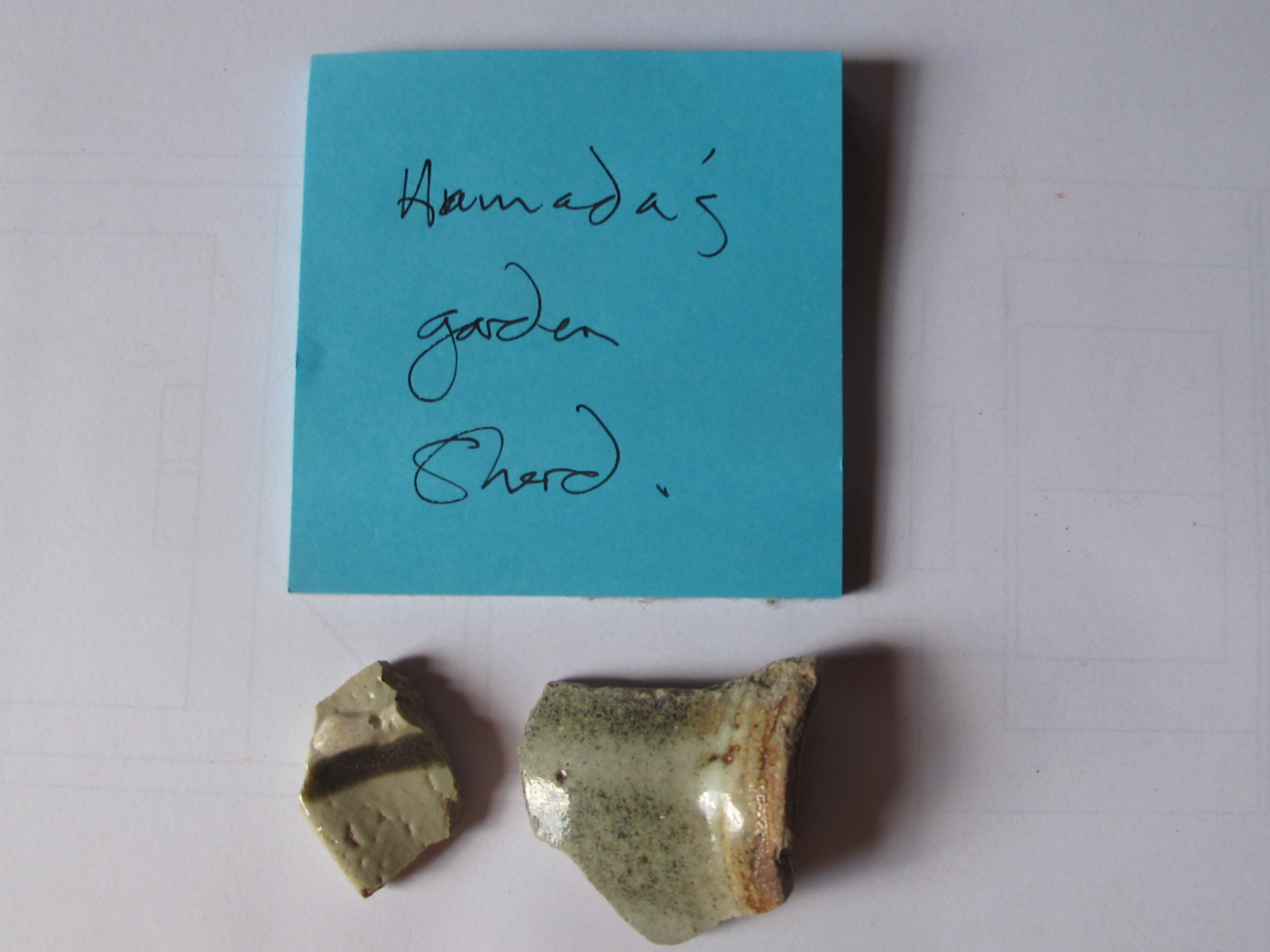 Later, when we visited Hamad’s compound in Mashiko, we were looking around the old kiln sheds at the kilns. It was raining and I saw that where the roof gutter washed down the garden past the kiln in a little drain, there was a glint of sunlight on something shiny and there were several pieces of broken pot that had been washed down the drain and into the garden soil. I couldn’t help myself. I picked them up and gave them a little rinse under the drizzle coming from the roof. I kept the nicest piece for my collection. A little piece of HamadaWare. Of course I can’t prove that it is Hamada’s. He didn’t sign anything did he? It’s a good sign that I have some imagination.