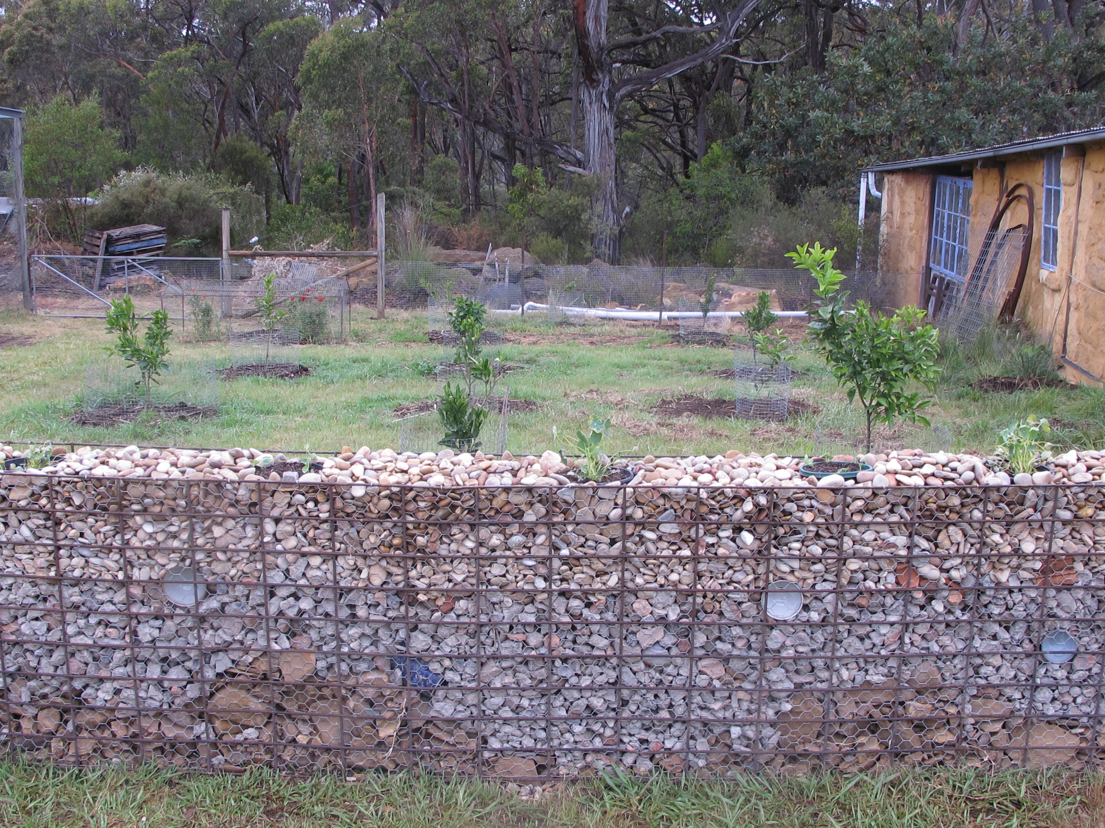 For the top fence, I decided to build a ‘gabion’ stone wall at the top, this will be fire proof and rabbit proof, protect the young trees from the worst of the south westerly cold winter winds, hopefully look good and allows me to use up a lot of ‘stuff’ that I have collected over the past few years, as I had in mind to make the front wall along the street out of earth, or stone, or possibly gabion walling. I hadn’t decided, and as I haven’t had the time to do it, no decision had been made. Now as I have this opportunity to experiment with this small, 11 metre long section of new wall, I decide to try a variation of gabion stone walling.