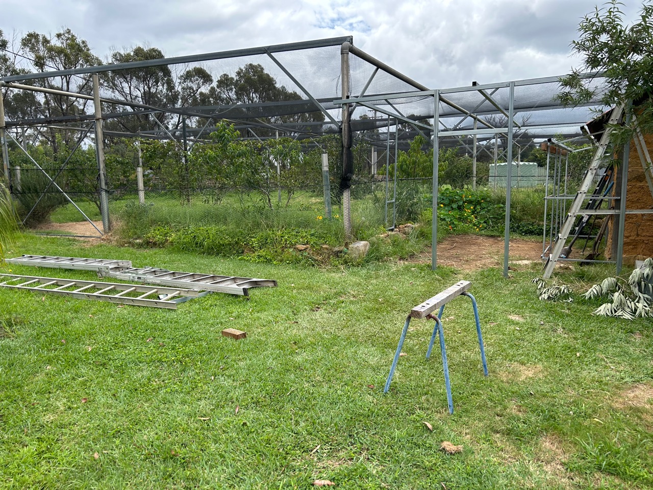 This weeks new chicken mansion is built into the gap between the new orchard and the old mud brick garden shed. It has access through a small gate into the covered orchard, where the chickens can explore and scratch all day in safety, without being swooped on, or chased by local dogs or foxes.