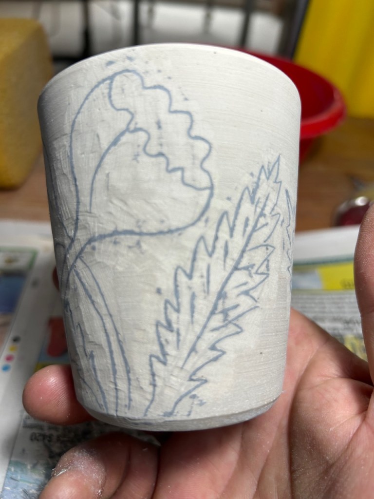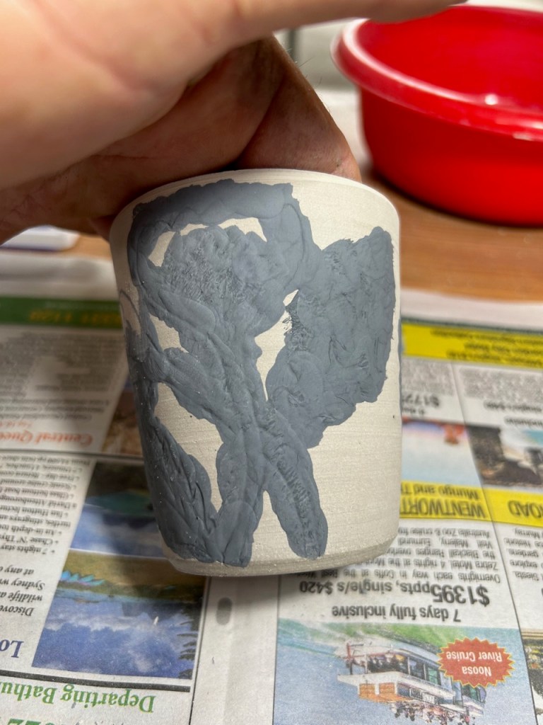 In the pottery, I’ve been extending my sgraffito on sericite work to include the negative/positive slip inlay. I tried mixing the two techniques and introducing some underglaze colour as well. I don’t know how these will turn out, as I’m packing the glaze kiln tomorrow.