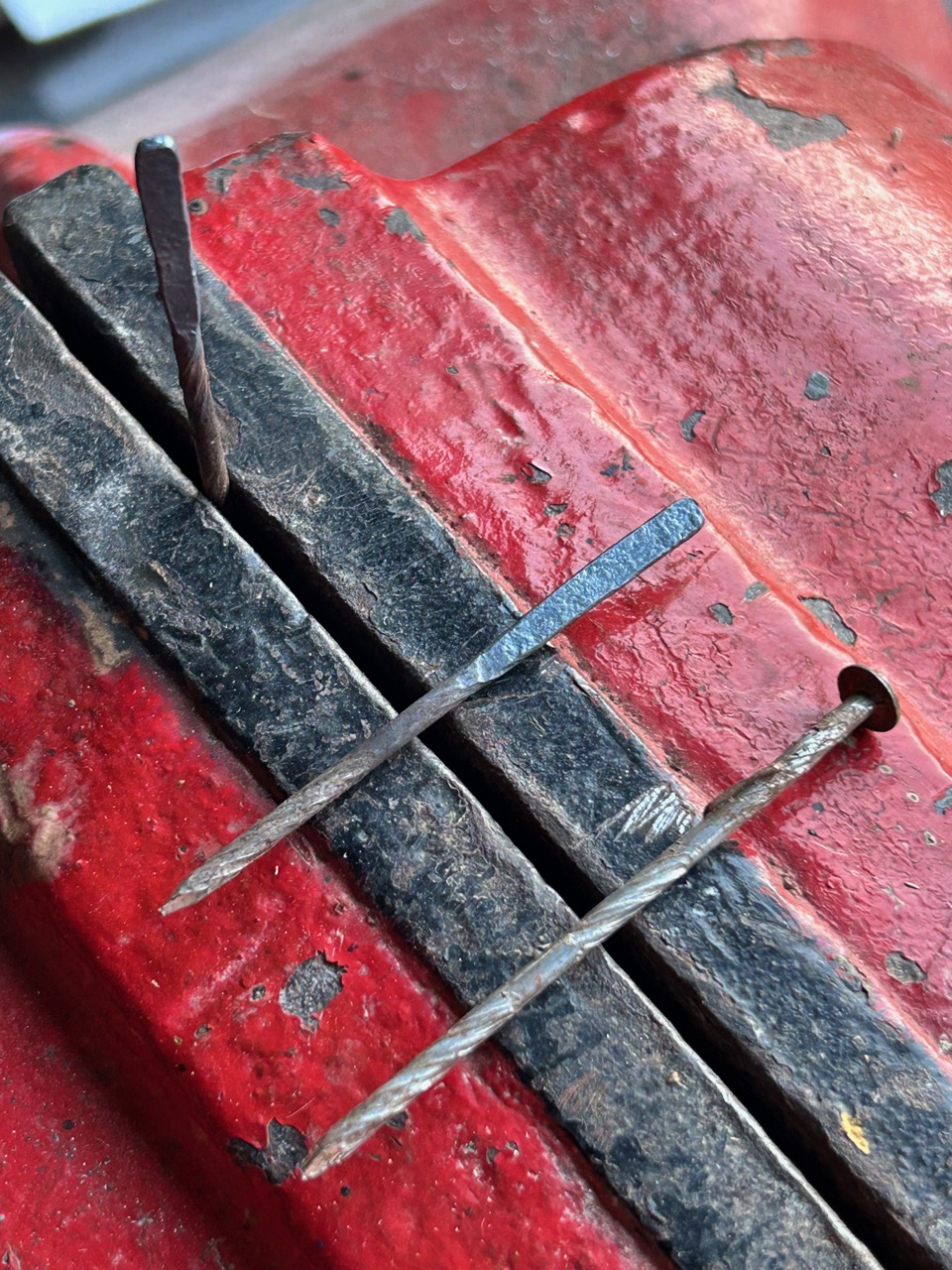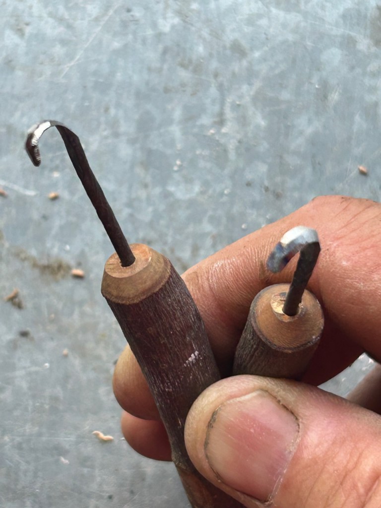 I’ve found that the sorts of sgraffito tools for sale here are somewhat limited, so I have been forging and hammering my own from rusty nails. They are rather nice, somewhat rustic and I can make them any size.