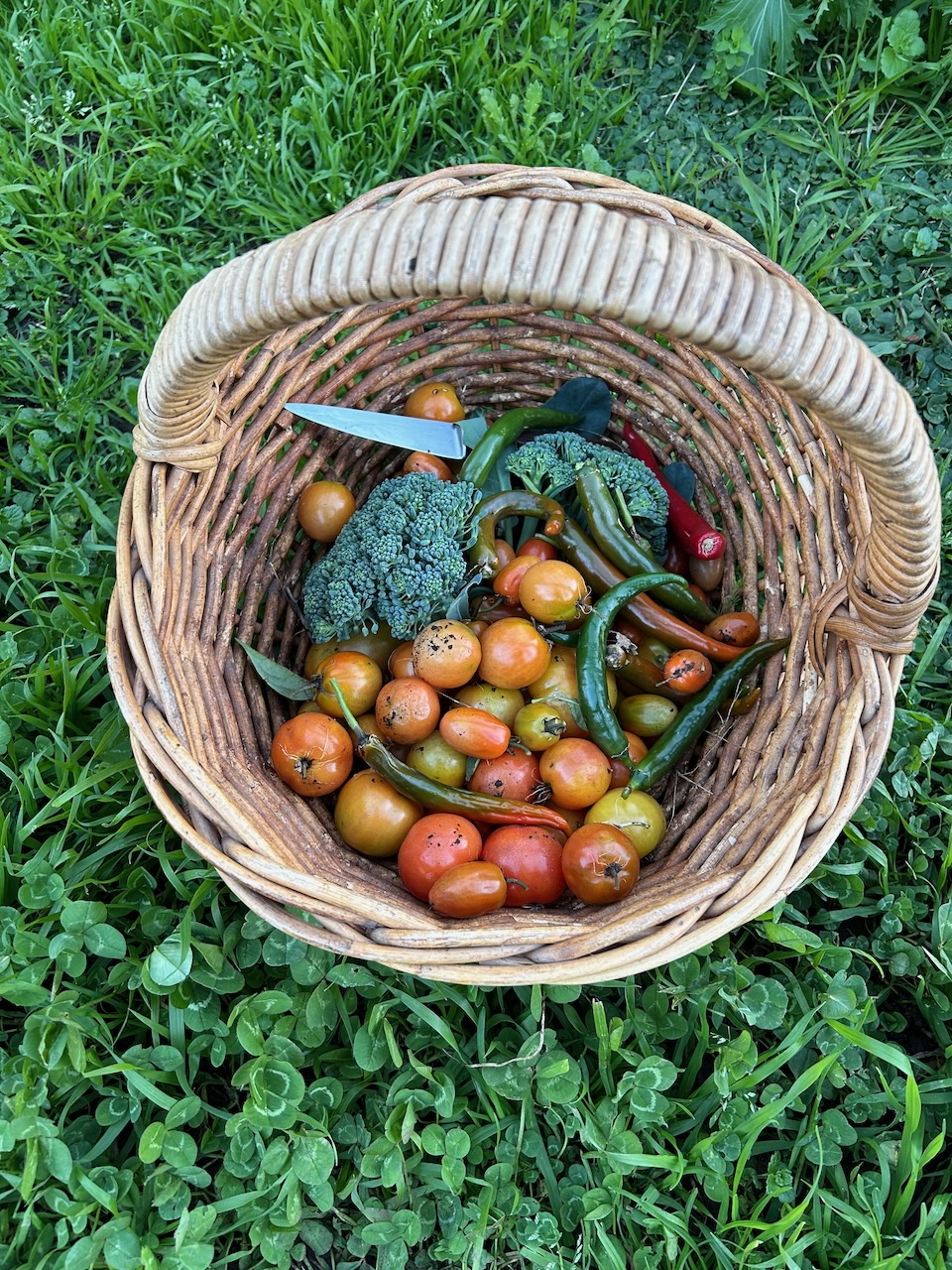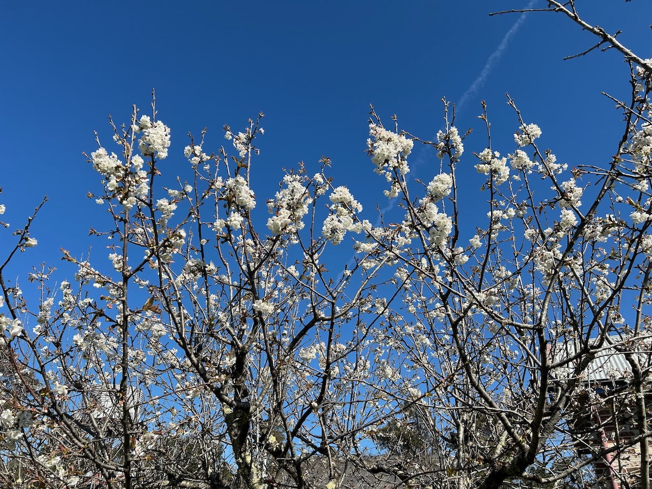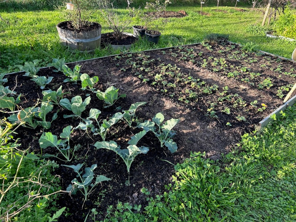 One of the apples gets white powdery mildew, a couple of the peaches get leaf curl. It’s a mixed bag. After lime sulphur spray, I go around and spread composted chicken manure for its nitrogen, dolomite powder for its mixed, subtle calcium/magnesium content, and some wood ashes for the potassium that encourages healthy fruiting.