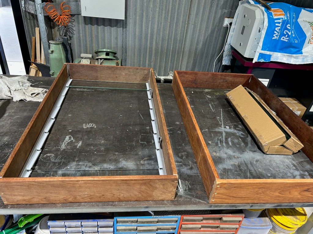 Out of the kitchen and onto more pressing practical matters, I made my own new flashing for the pottery shed windows from two sheets of 2440 x 1220 x 0.9mm sheets of galvanised steel, that I cut and folded on the guillotine and pan break, custom fitted for my windows. The lengths of flashing have to be marked and then cut out to perfectly fit into the curves of the corrugated iron sheeting on the walls. In a perfect world. The shed builders should have fitted flashing above the windows before they installed the outer wall sheeting. But they didn’t bother to do anything at all, so the window seals around the edges leaked. But not any more.