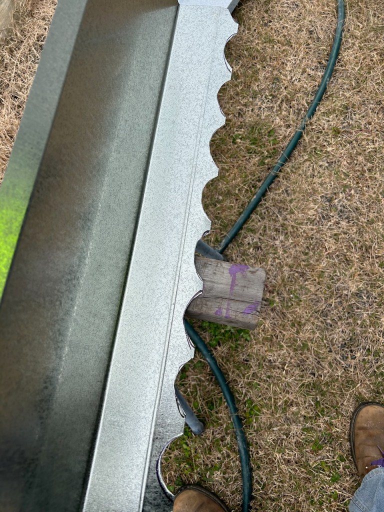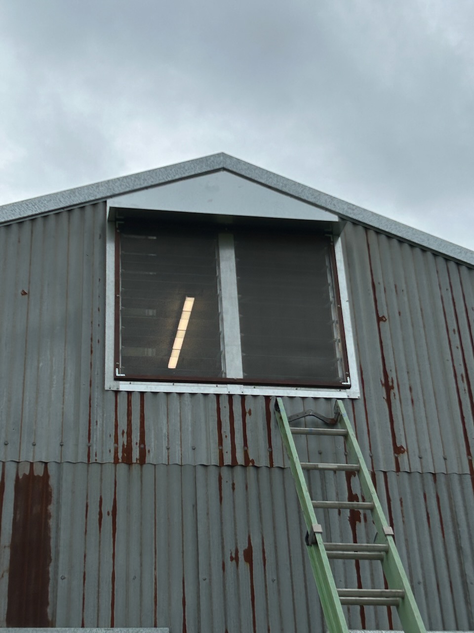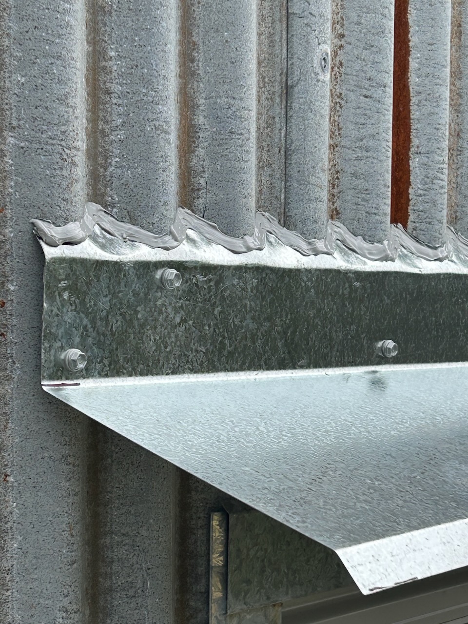 We spend a day going around the building and fitting the new flashing above all the openings. We can’t take off all the cladding to do it properly. As it should have been done. So we add the flashing onto the wall sheeting and cut it into the profile and seal it with silicon. It’s quicker, but still takes us all day to do 5 double windows and 3 garage sized roller doors.