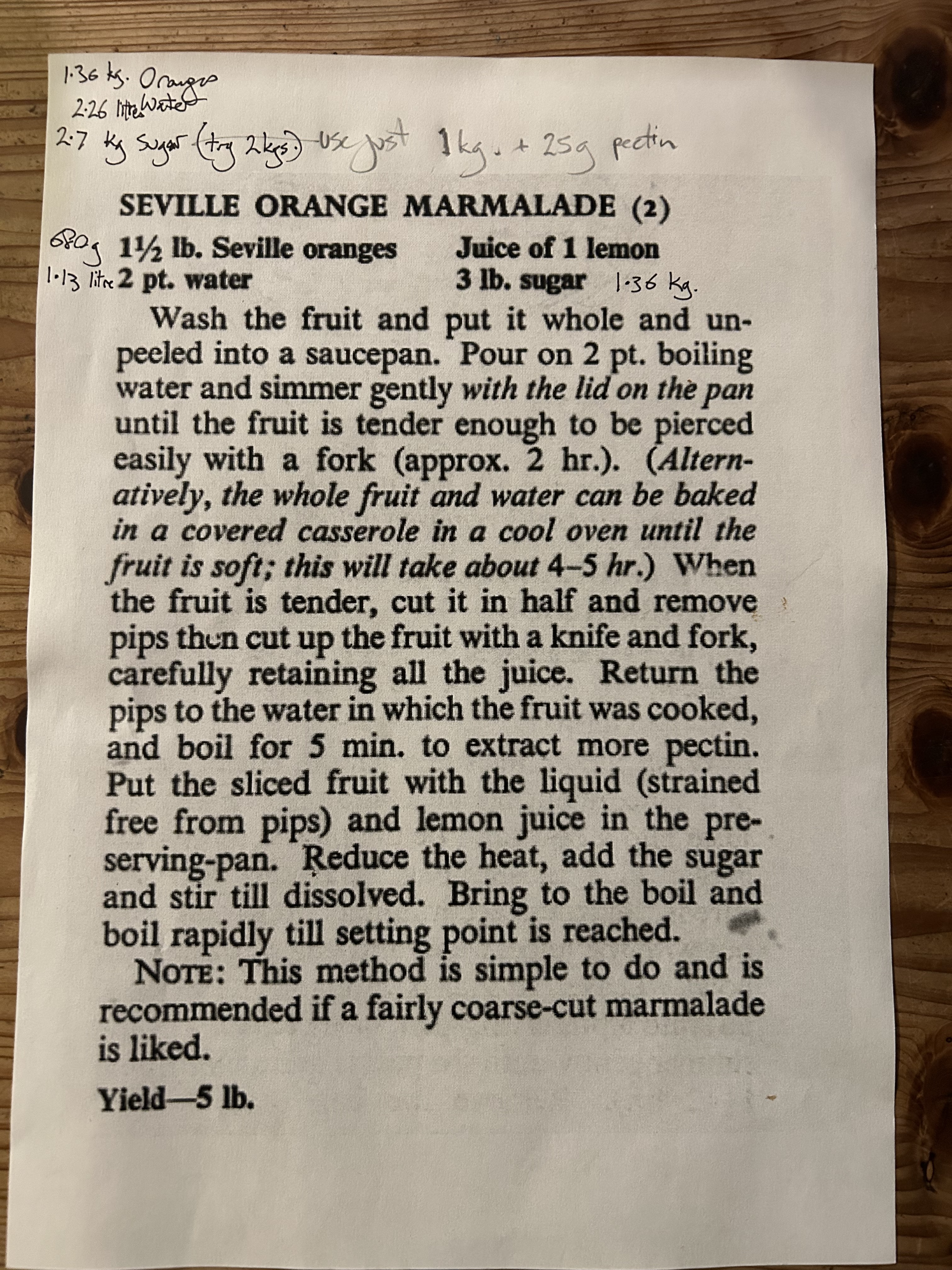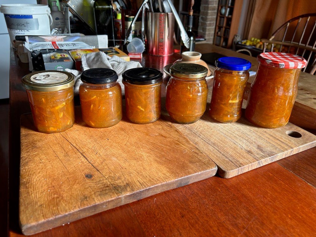 Out of the garden and into the kitchen. Winter is also peak season for citrus fruits. We have been making batches of marmalade since the season started back at the beginning of June. This week I have been trying out an old recipe that I got out of Mrs Beaton’s cook book. I have the paperback facsimile edition from the mid seventies. I was encouraged to try it out by my friend Bill who makes lovely marmalade. I occasionally post him a box of Seville oranges and he later returns a jar of his latest batch of marmalade. A good arrangement.