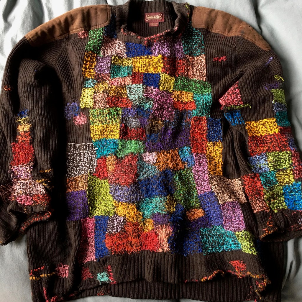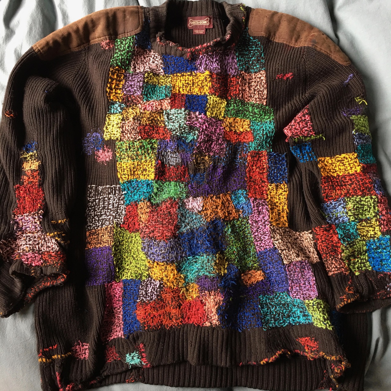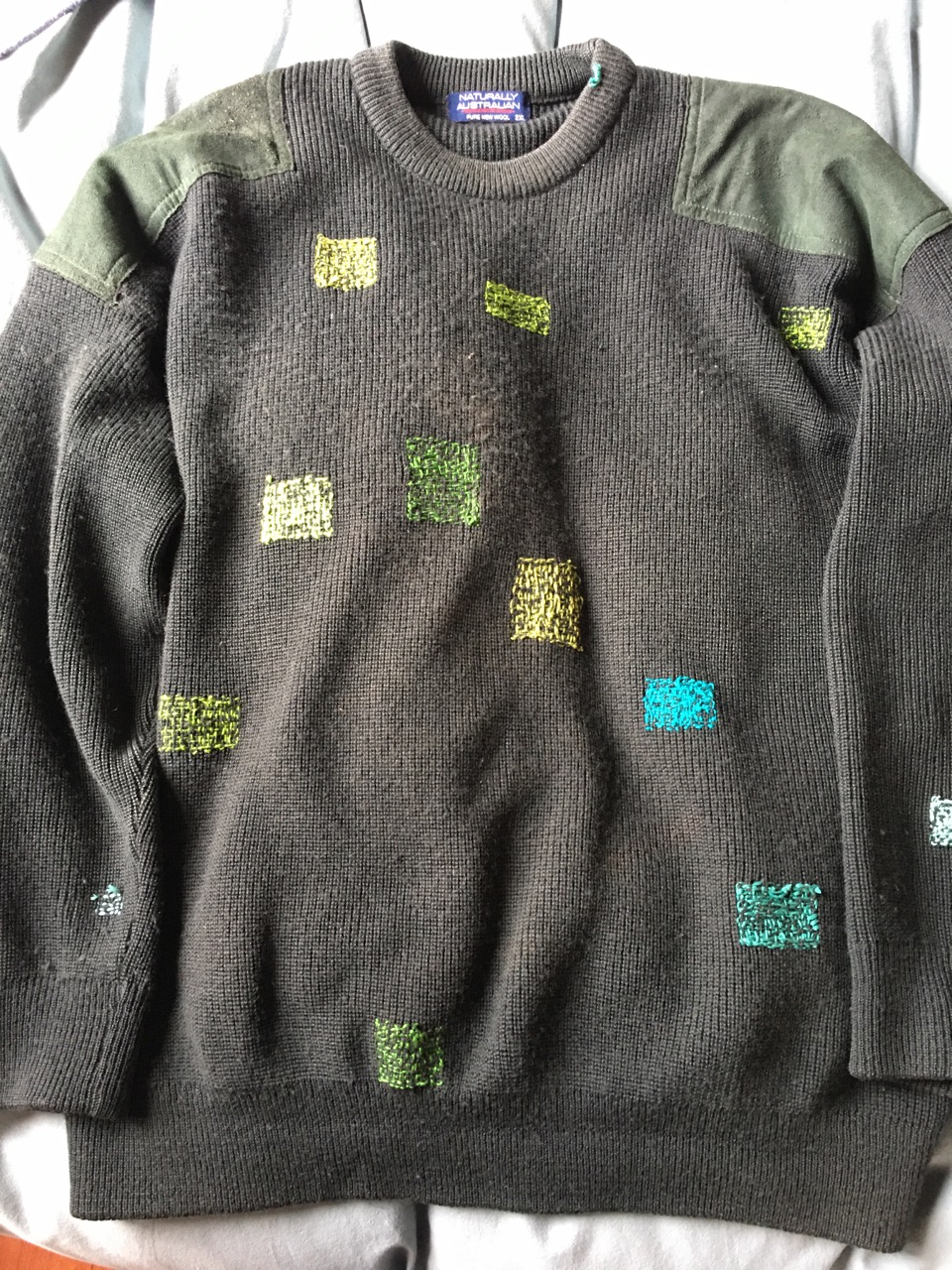 This series of repair sessions that began 13 years ago trying to extend the life of a good quality piece of clothing, slowly took on a life of its own. I think that I may have made this old brown jumper a bit too special for welding and firing now. It’s become rather special in its lovingly repaired old age.