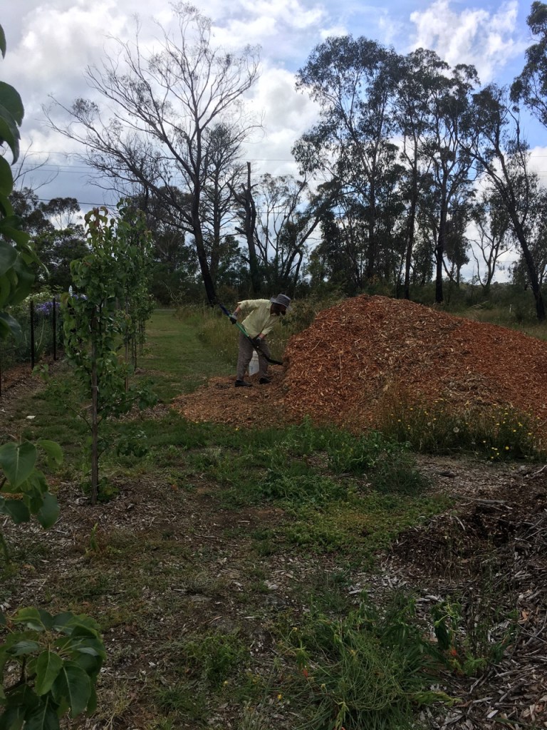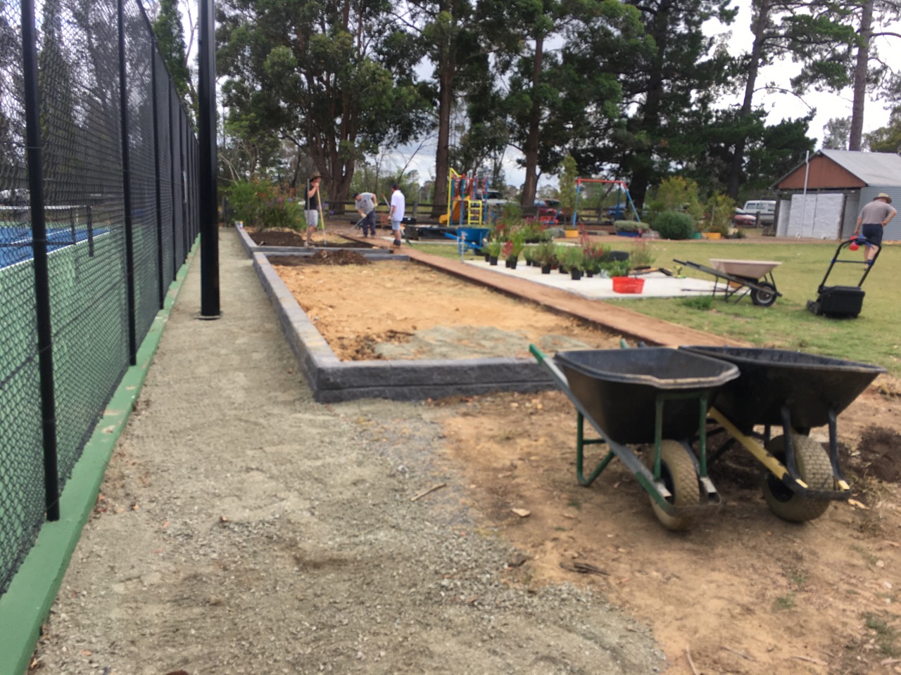 Janine did a lot of pruning and mulching of the existing garden beds, while I helped with the wheel barrowing of several tonnes of road base , then gravel to create new paths, followed by filling the new garden beds with another few tones of topsoil and mulch. The final part , was to plant out all the donated plants to fill the new beds.