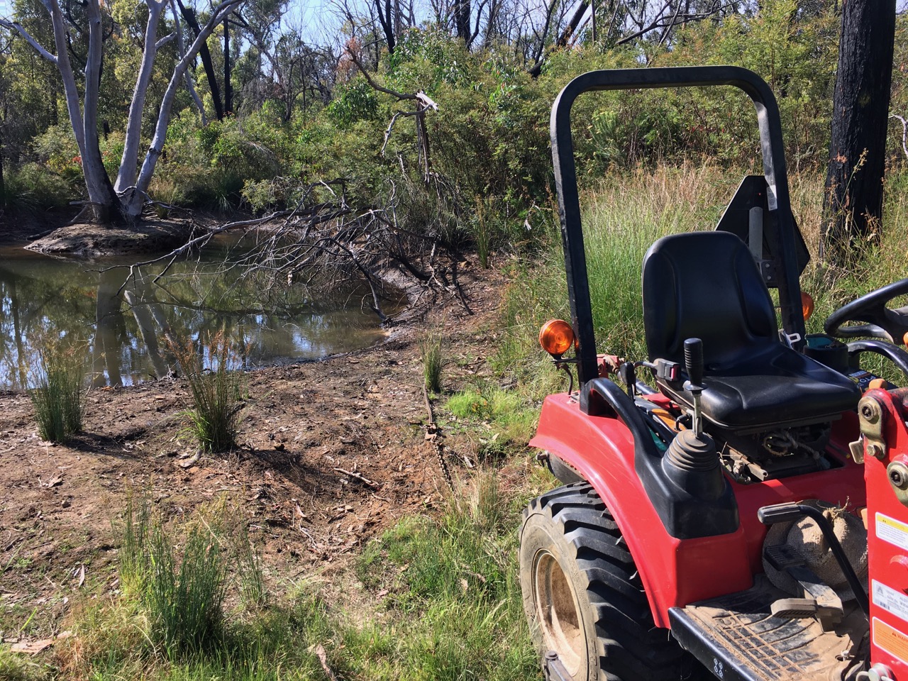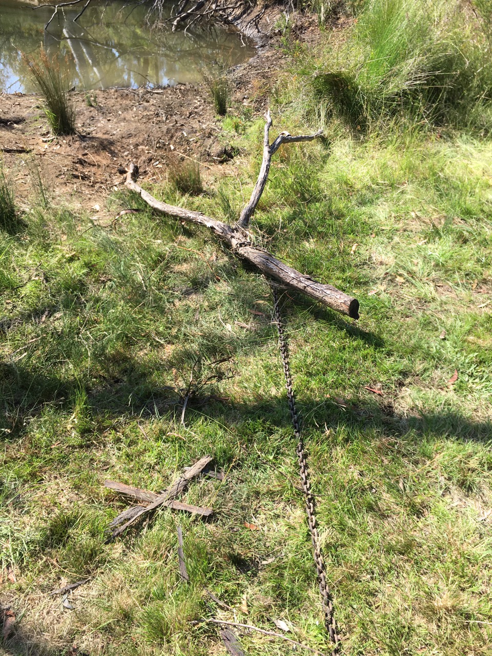 Janine engaged deeply with nature by walking into the muddy dam fully clothed to hook some very heavy load chain around the dead tea trees bushes that were killed by the fire, and have been sitting in the water, standing dead and ugly for 3 years now.
