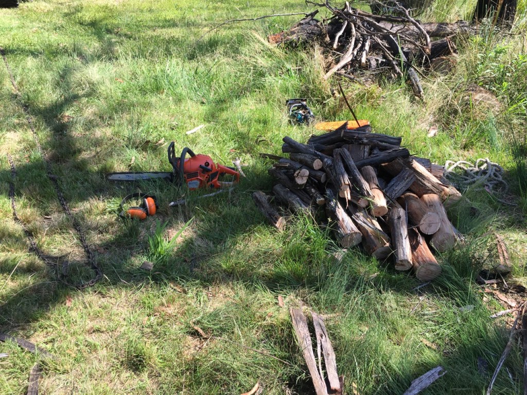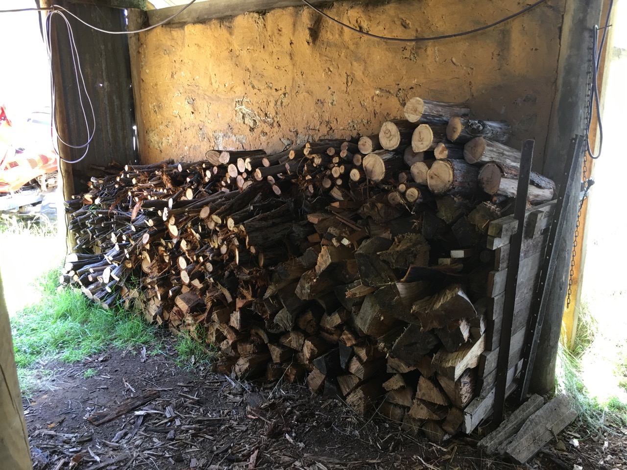 We have several tonnes, possibly 10 tonnes, of wood cut and stacked, with just 4 more trees to work on tomorrow. I’m trying to get all the logs and timber detritus out of the way of the fencers, so that they can work efficiently and un-interrupted tomorrow. I also get a lot of satisfaction in seeing it all cleared away and neatly stacked.