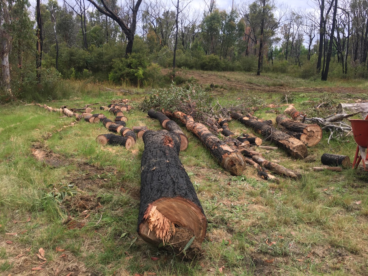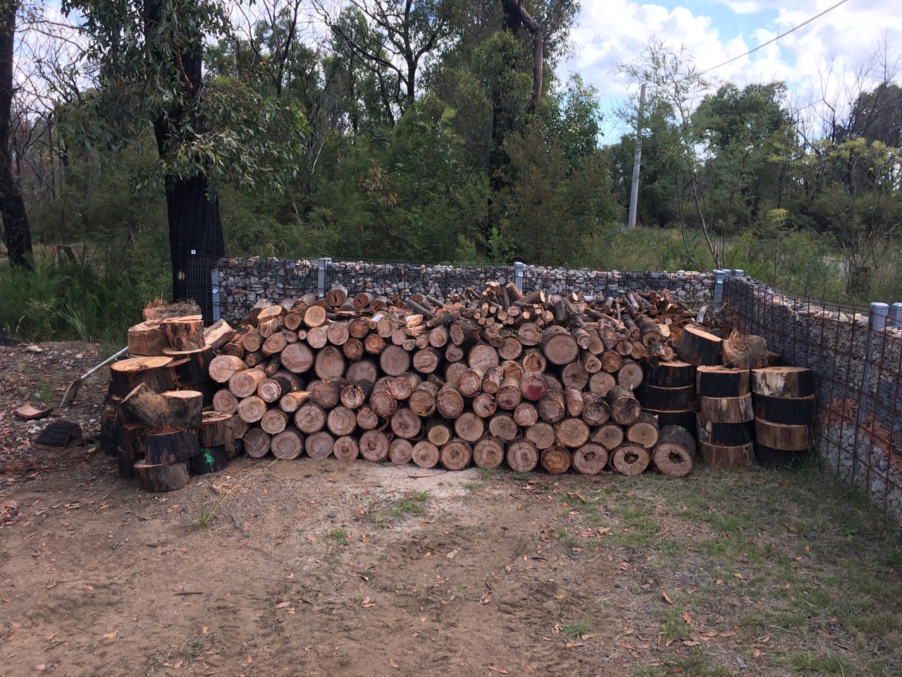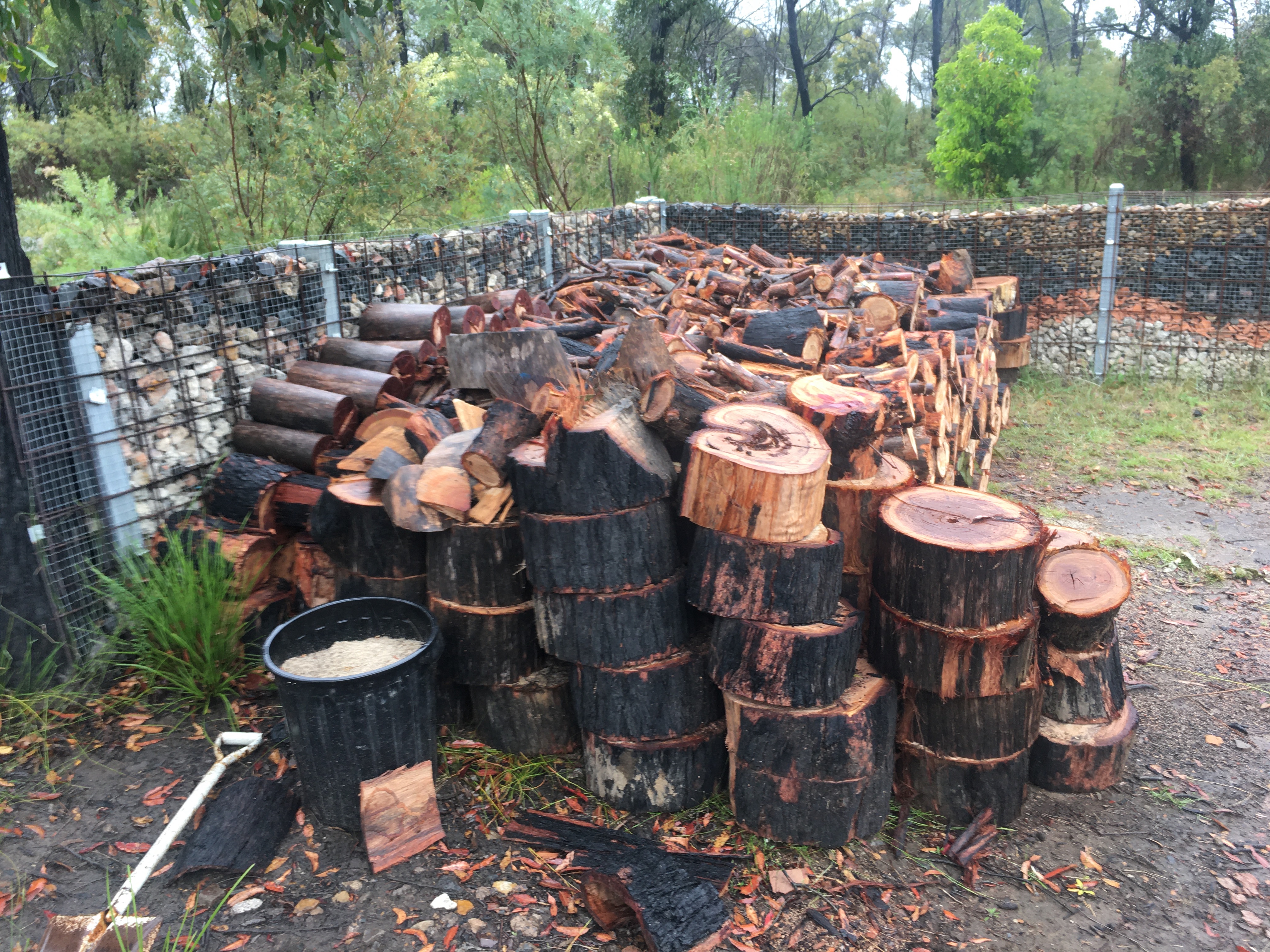 All the trees in question are already dead. Standing blackened, leafless and burnt dead. Victims of the catastrophic bush fire that raged through here 3 years ago. I have no idea why I wanted to ’save’ them. Just habit I guess? So out they come and the line of the fence is straightened. They drag the trunks out of the way and into the clearing where we stack our fire wood. A place well away from the house. I spend a day chain-sawing. I stop regularly to refuel, re-oil and sharpen each of the three chainsaws. Large, medium and small. I spend all day at it, but can’t keep up with the delivery rate that the fences are dragging the dead wood out.