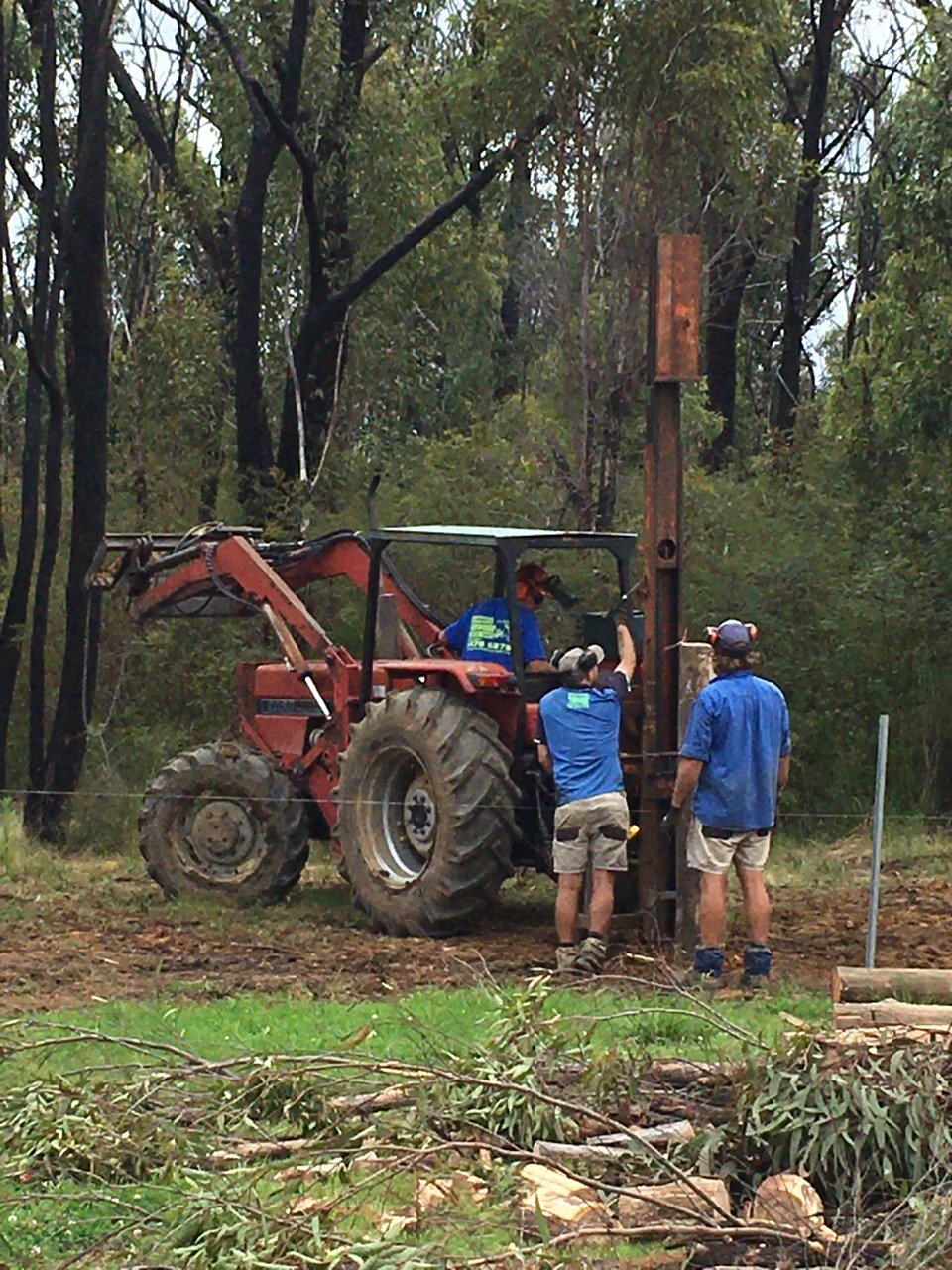 They have an antique tractor, fitted with an antique post hole drill and fence post rammer. They drive the iron bark posts 900 mm. into the ground. The gear may be a bit old, but they work fast and efficiently.