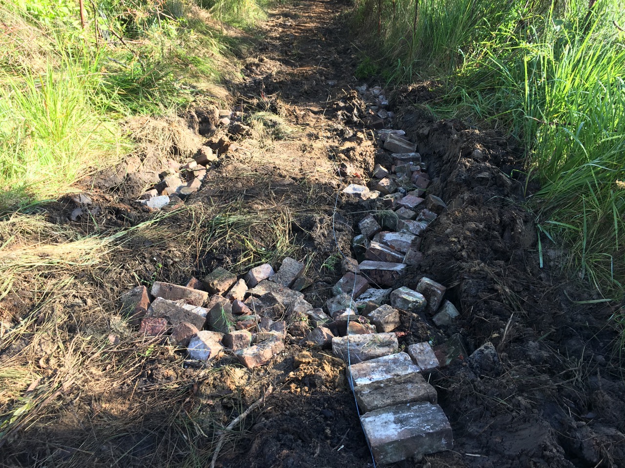 Wednesday morning we spent a few hours loading barrows with broken bricks , left over from the brickwork on the facade of the new pottery building. I knew that all those broken bricks would come in handy one day. I fill the deep muddy tyre gouged trenches with the brickbats and stomp them down into the mud. This may not be enough, but I’ve filled the deep trenches, so we’ll see how the tractor goes over this lot before I barrow another 20 loads down there. I’ll try and finish off with all the smaller pieces and mortar sand and gravel when this is all over.