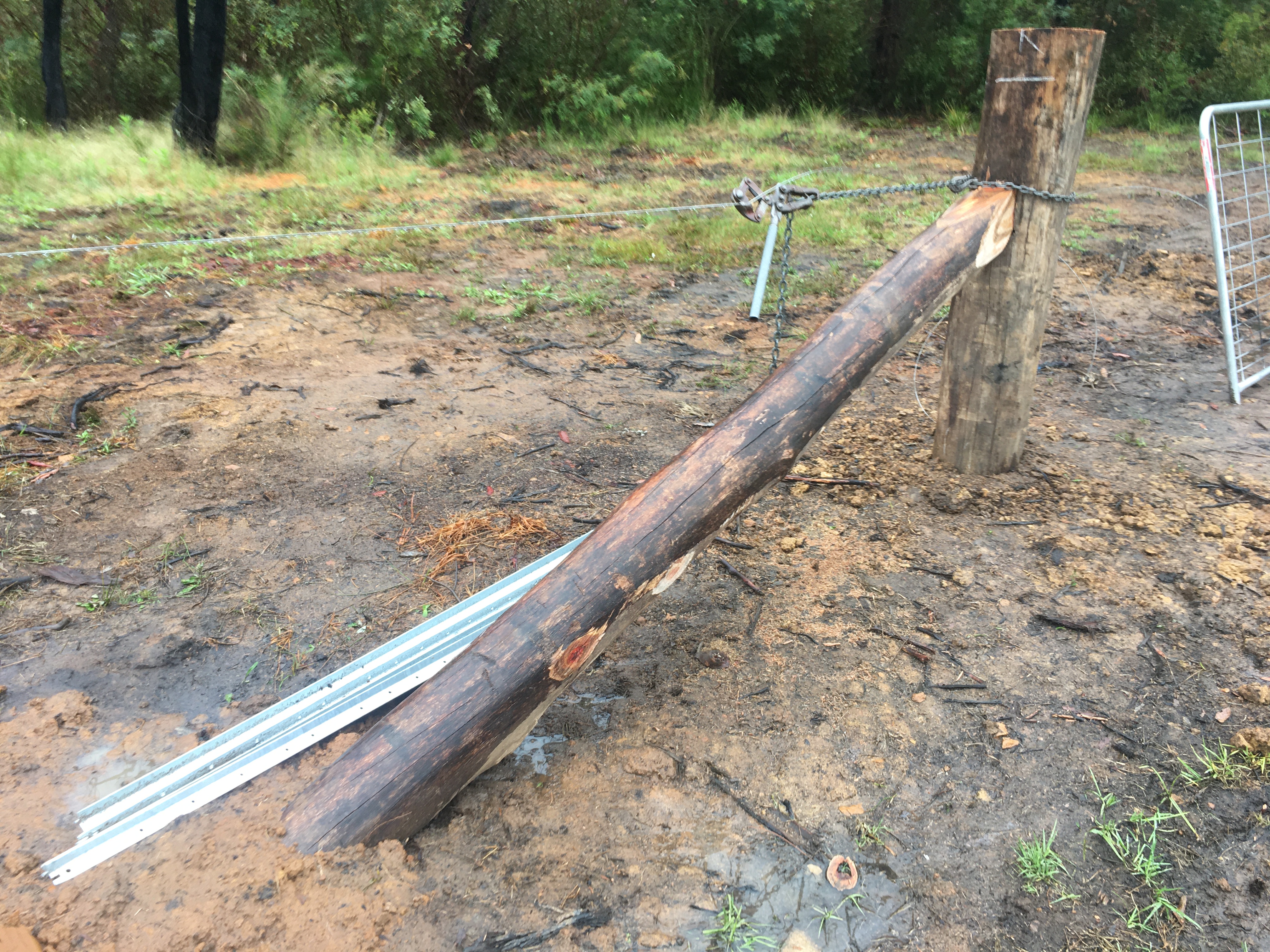 Phil and his sons have done a very nice job of staying the strainer posts with a mortice and tenon joint in the iron bark posts and a huge flat stone embedded into the soil to buttress the other end of the stay. A very impressive and thorough job.
