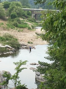 Slowly a fisherman comes into view, he is strolling quite slowly up stream with his net in hand. He is working the river between the road bridge and the foot bridge. He stops to cast his net out occasionally, apparently with little or no success. I’ll put my money on the cormorant any day.