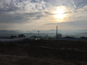 The sun is well up and I can’t see the sun. The air is just as dirty today as it was yesterday and will  be tomorrow. I imagined when I arrived here this time that it was just some intermittent phase in the air currents. I don’t remember it being this bad before, one, two, three or even 4 years ago. This is my 5th visit to work here. Miles away from the industrialised region of Seoul and it’s the worst that I’ve seen it. The air should be cleaner here. It used to be. I remember being appalled on my first visit here when I returned to Seoul to fly out. I couldn’t see the sky scrapers through the coach’s windows until I was right next to them. This is awful, I was appalled before, simply because of the contrast of country and city. I feel my chest tightening each day. Now the smog is every where. There is nowhere where it isn’t thick and grey.