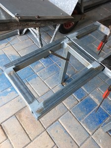 I have built a new pug mill table out of my spare off-cuts of gal RHS and stainless steel sheeting from the kiln factory. I have designed it so that the pug can be extruded out over the end of the table onto the extended table, I can then fold it away again after the pugging. I set it up with a diagonal retractable brass brace that hooks into place to hold the extension horizontal when needed.