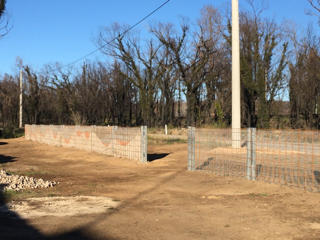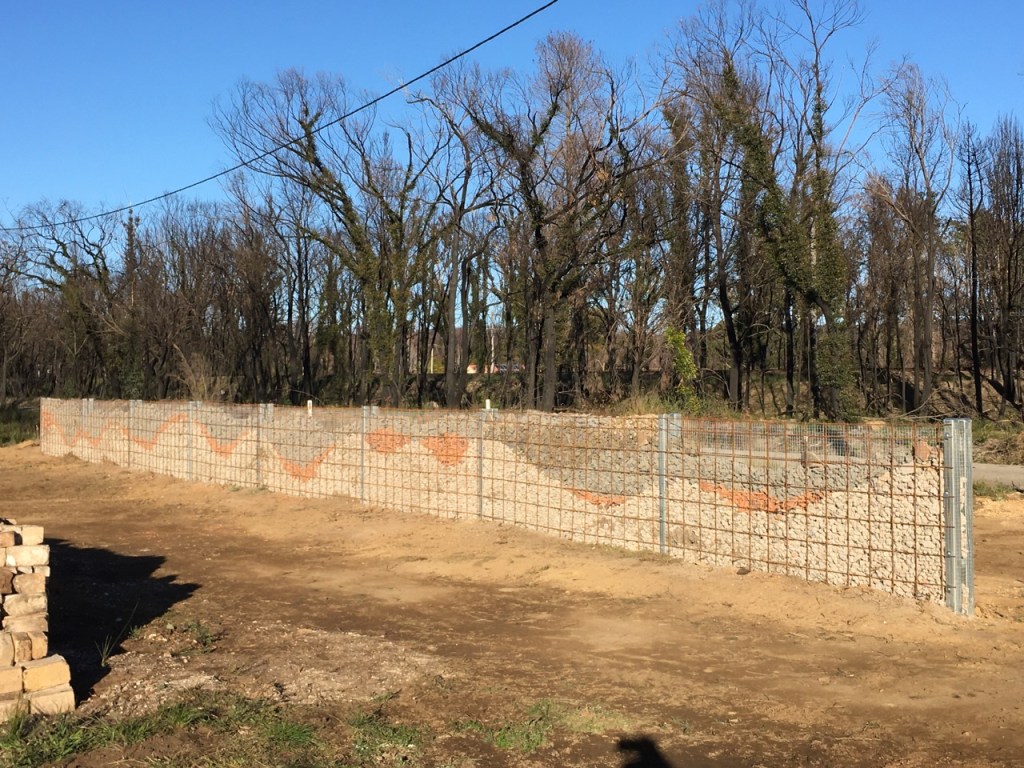 We have now completed all the 1200mm high wall sections, about 90 metres, at a cost of $1200 for the fill, this was possible because the steel yard where I have bought all my steel for the past 40 years, donated $2000 of credit into our account to help us in our re-building.  We now have 90 metres of interesting and fire resistant fence. The real cost is in the labour that we, and a lot of friends, have put in to make it happen. One very good thing about building such a fence as this is that we can turn up and do a bit when ever we have a day ‘off’, and time to spare. The last 30 metre section of the wall will be built 1800mm high in front of the house to give us extra protection from the ground fire in the next fire event. We have also planted a lilli-pilli hedge all the way along the wall to give somewhere for the little birds to live. Lillipillis are reasonably fire tollerant. They don’t add to the spread of flme. They have small leathery leaves that tend to just shrivel instead of burning. We hope that they will act as an ember filter in the next fire event, as well as acting as a safe bird habitat in the mean time.