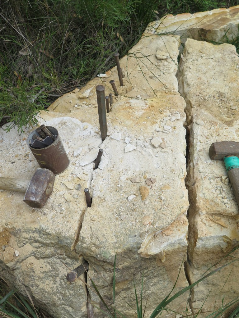 I am very keen to live a self-reliant life. I pride myself on having done almost all the trades around here over time. I only employ trades when it is required by law, – like electricians for instance. But, there are some jobs that are just too big for me to handle alone with my crow bar, chain blocks, tripod, little ute crane and toy tractor. Moving 1 tonne stones is one of them. My only way to handle these big sand stone floaters that I dug out of the vegetable garden area 20 years ago, was to get out the stone masonry tools and using a lot of small ‘gads’, to split the bigger stones into smaller pieces, so that I could lift them with my little tractor.