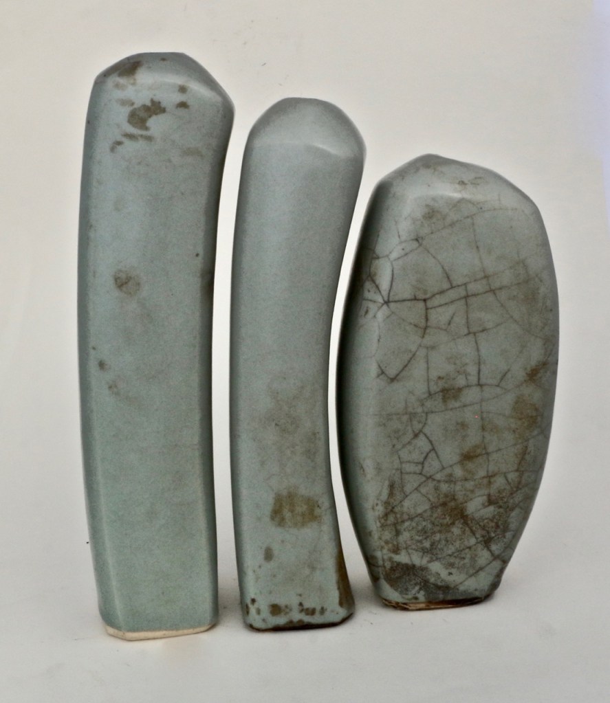 This is a lovely triptych that survived the inferno. It has a very satiny smooth guan-like glaze enhanced with a smokey patina and sooty crackle.