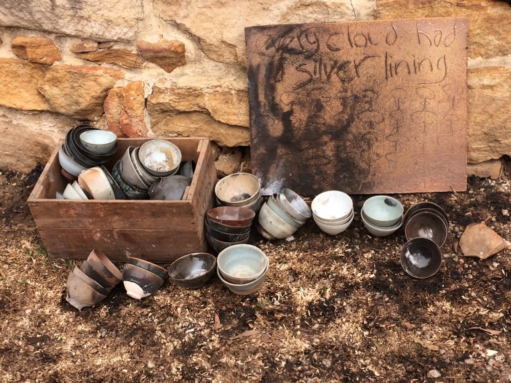 We still have two other examples of these big cylindrical pots in our garden, just 2nds with minor cracks that happened during the 2 year project. One is still intact, but the other was smashed by the tree loppers when they were clearing up the mess here in our yard straight after the fire. One of the workers drove into it with the bobcat loader.Janine and I re-constructed it with wire strapping just to preserve it until I have the time to do a full kintsugi repair. It will take a lot of gold!