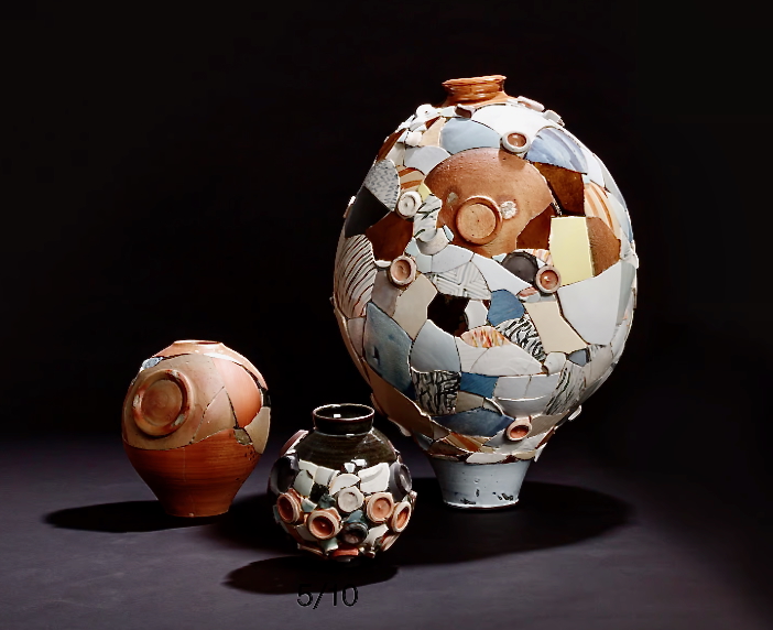 ‘I’ve finally completed the commission for the Powerhouse Collection. I was chosen as 1 of the 6 artists to make new work for the collection, as part of the ‘Willoughby Commission’, way back in 2019, just a few weeks before my workshop and studio were destroyed in the 2019 catastrophic bush fires. It has taken me over 3 years to get back on my feet with a functioning creative workspace. I have spent the last 12 months since then assembling this new work. My original thought was to make beautiful porcelain bowls that encapsulated my love of a quiet, gentle and sustainable approach to life and making. But all that was dashed in the fires, when all my lifetime collection of ceramic materials, kilns and buildings were destroyed in just one day. I stayed to defend and save my house but suffered considerable trauma in the process. I have created this new work for the collection to reflect the chaos and destruction that I endured. I decided to work with the many hundreds of shattered pieces of broken pottery that littered the site after the fire. A few pieces were broken but had the potential to be repaired using the ancient Japanese technique of kintsugi – gold repair. These few small bowls, although damaged, had the potential to be recovered with patient attention to detail. Kintsugi expresses a desire to ‘honour’ a damaged, but still lovely object by giving it time to be rebuilt, and eventually to possibly become even more beautiful than before, because of the time and effort spent on it. I spent some months, part-time, cleaning, repairing and re-constructing missing parts of these bowls to make them ‘complete’ again. They are whole again, although different from before. Damaged and altered, changed from what they were, but in some ways ‘enhanced’ and given a lot of love and care, they are somehow more beautiful, but in a completely different way. They became symbols of my journey to recovery. This work of slow repair and enhancement gave me to idea to create new pieces that didn’t previously exist but created from the mixed shards sieved from the ashes of the ruins. Completely new work, but made from a composite of all my old work. It’s been a very slow and tedious job of work, assembling a thousand small, burnt, broken and shattered shards all back together in a new combination to make ‘compendium’ pieces of my life’s work. Each shard needs to be held in place until the glue sets, so only a few shards can be added each day. I’m calling them ‘abstracts’, not because they have any relationship to modern painting, but because an ‘abstract’ is the first part of an academic thesis, which summarises the contents of the entire paper. In this case, these newly constructed vessels comprise many small shards of my work made at different times over my career, mostly sifted from the ashes of the old pottery after the fire, but also containing a few new post fire pieces as well. In this sense they are a summary of my life’s work, presented in a new form. An auto biography, or a ‘self-portrait’ in ceramics perhaps? They contain a small part of every phase of my career from my earliest days here, through to the present. Just as I have rebuilt my shattered and damaged self through a lot of trauma therapy since the fire, I am mostly better, but still carry a bit of lingering damage with me. I’m repaired and reconstructed, but different.