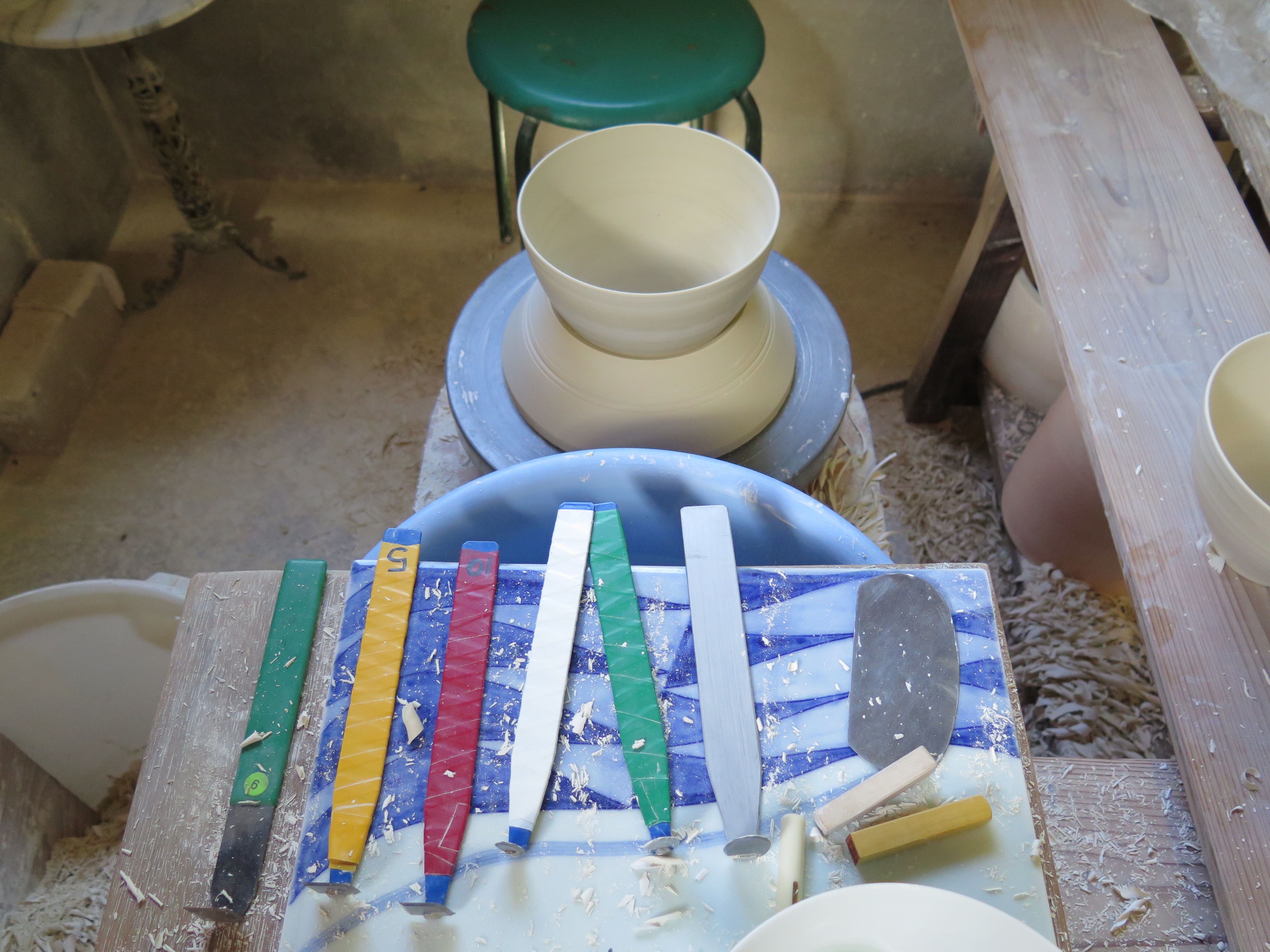The turning here is a different story to what I’m used to. It takes me back to my student days working for the Japanese Potter Shiga Shigeo. He was trained in the porcelain techniques of Kyoto and worked for the ‘Nation Treasure’ potter Tomimoto in Kyoto, another porcelain centre of excellence in Japan. Here they turn not just outside, but inside as well. I’m not used to that. I have tried in the past to get my form just about right on the wheel, so that there would be as little turning as possible. Here they all seem to use the ‘nobebere’ profile stick to throw the forms. Another thing that I’m not used to. But I’m here to learn and to experiment.