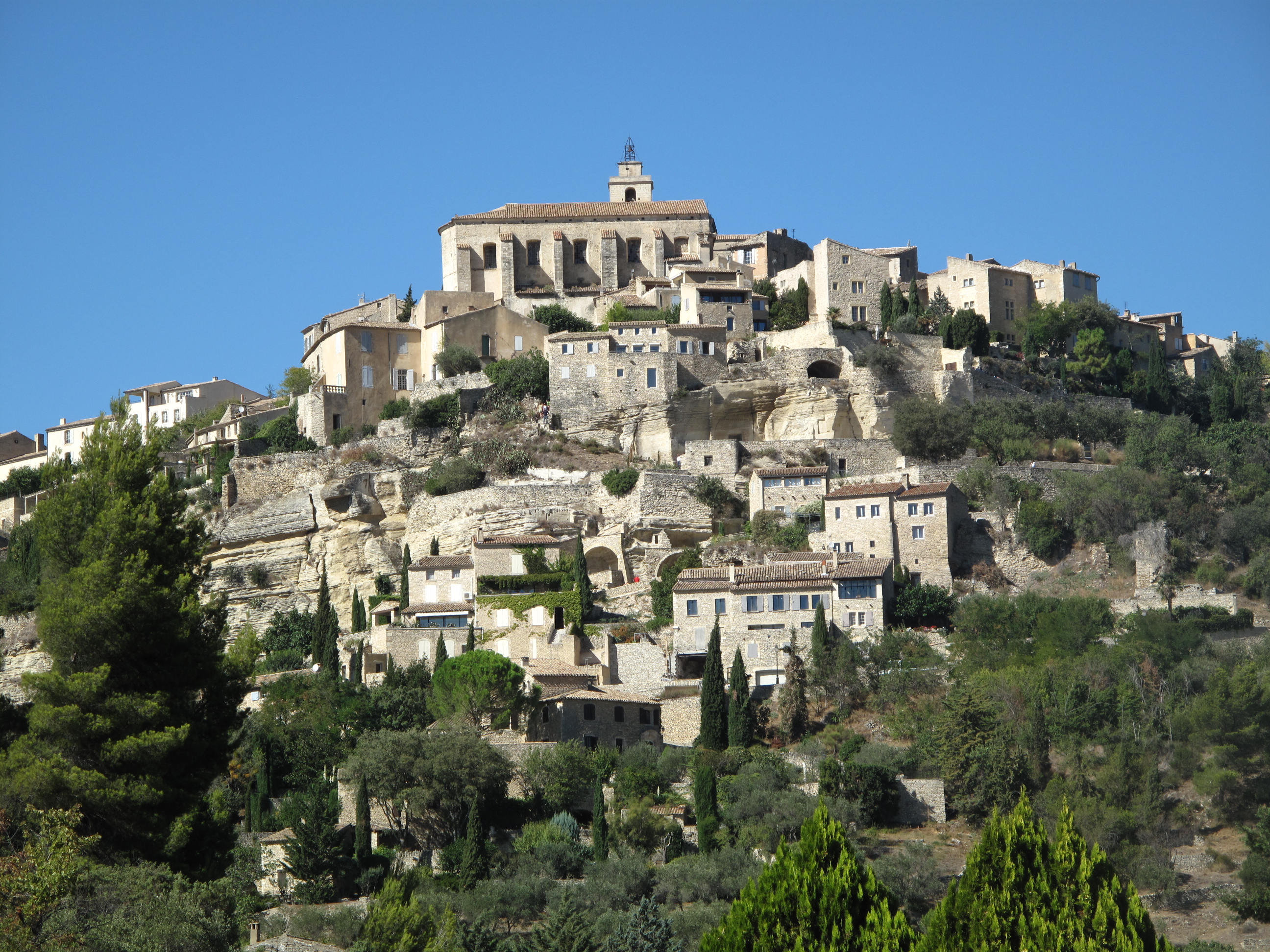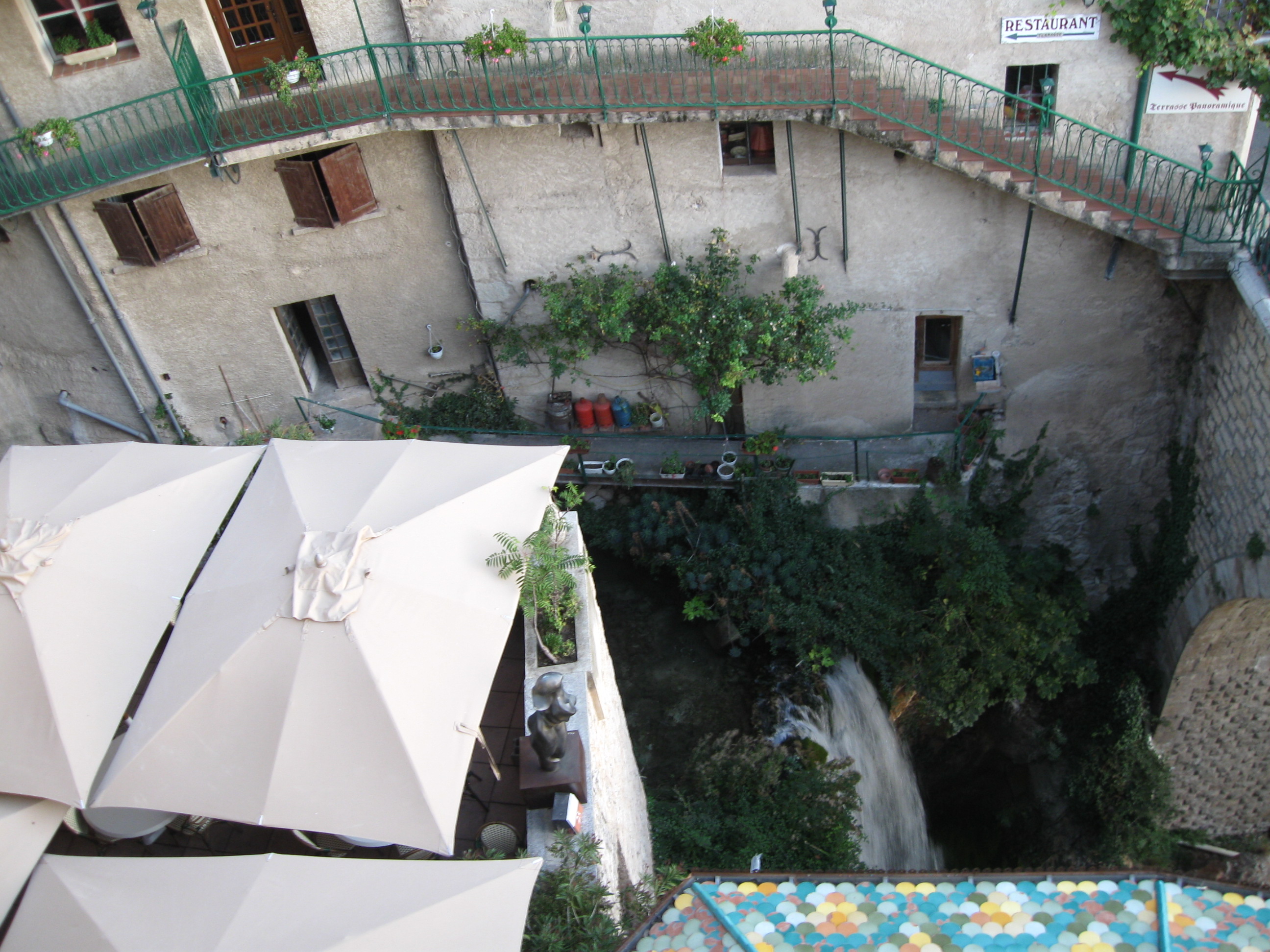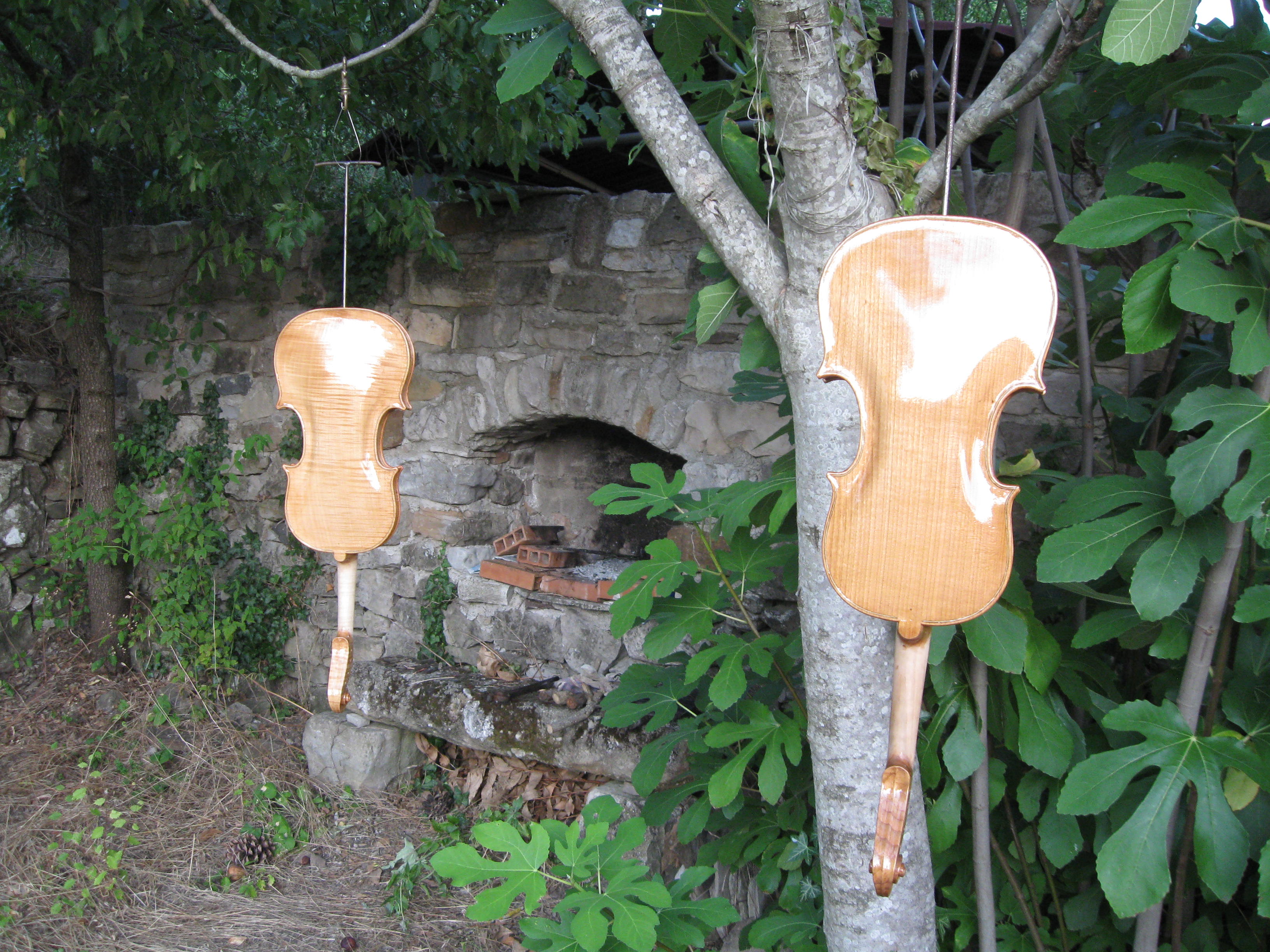 We have breakfast out on the top level garden. There are two new, beautiful golden blond violins hanging in the apricot and fig trees. It appears that violin varnish dries superficially to touch dry but then needs ultraviolet light to cure fully through the various layers and harden to a tough and durable, hard working finish. Apparently, there isn’t sufficient light in the far north of Holland, out in the north sea for the varnish to cure properly. So Stefan brings his recently finished and varnished violins down to the south of France each time they visit, so that these instruments get their full quota of ultraviolet. They make a very pretty addition to the garden and add a quirky ambiance to the surrealist scene of our breaking fast. We chew and chat and drift off into our own thoughts, staring out over the mottled terracotta roofs of the village, across to the ruined castle on the opposite hill.