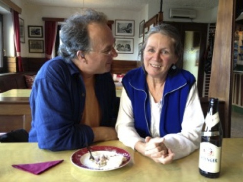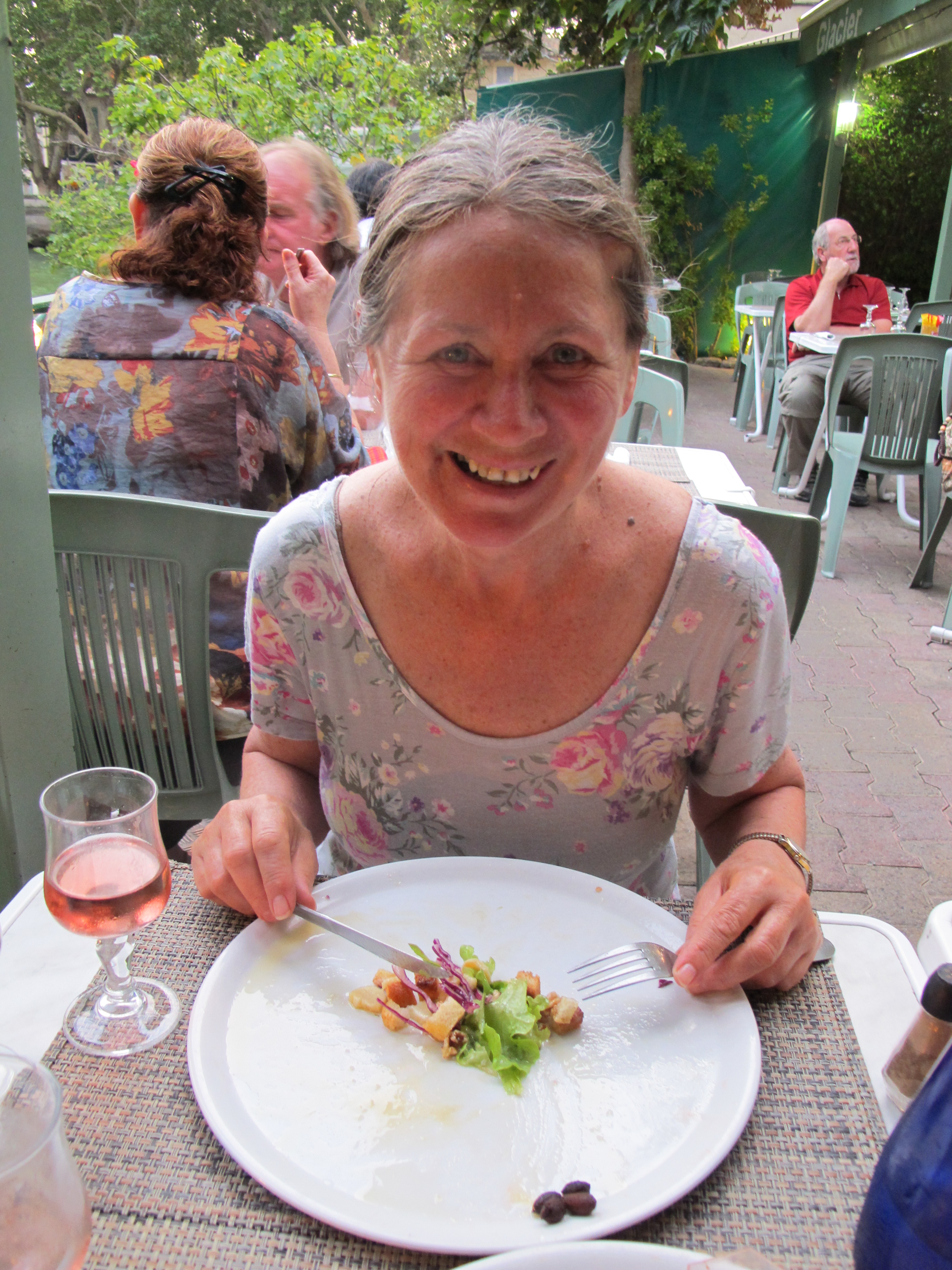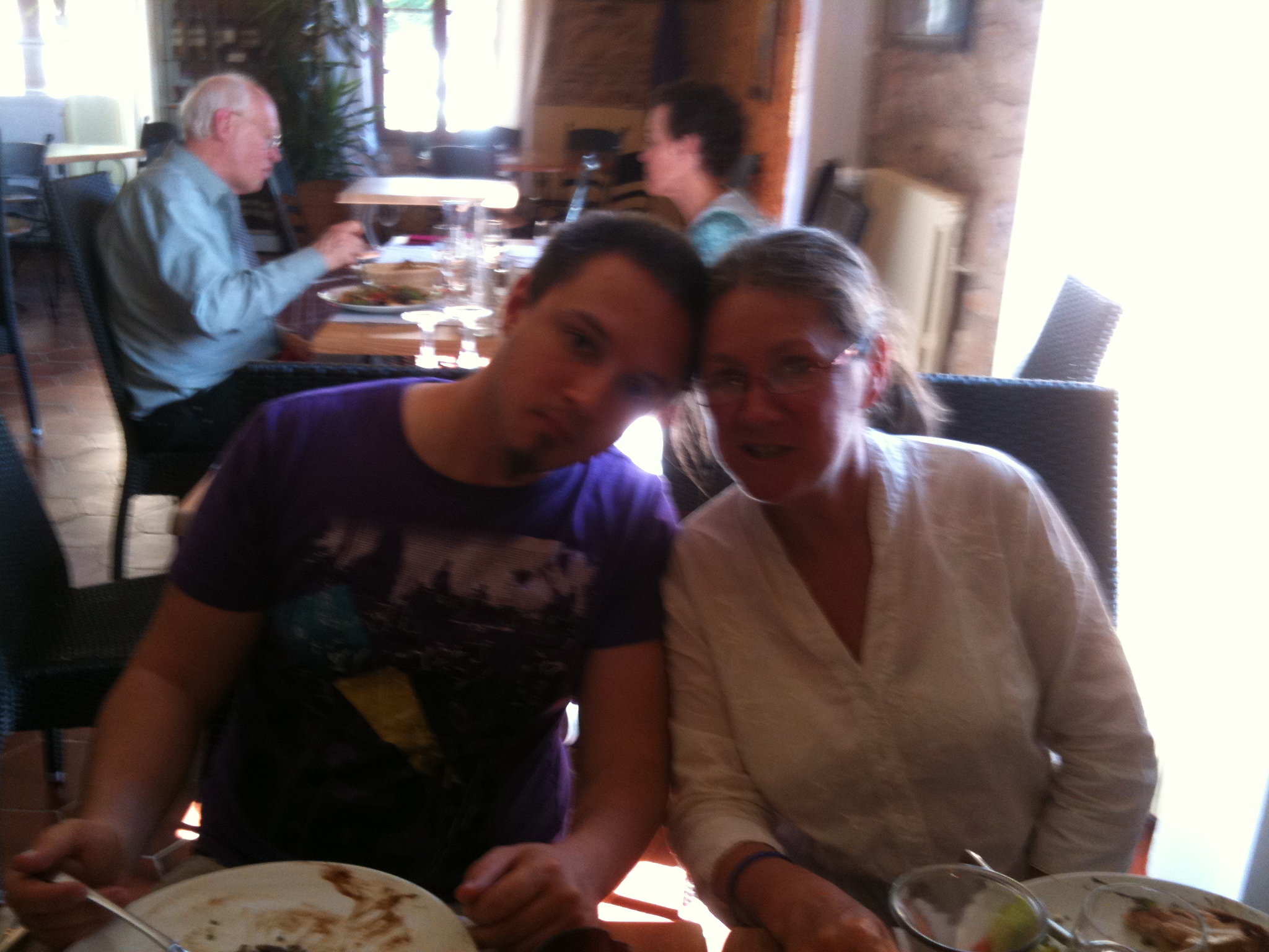The cafe only does lunches, so in the afternoon they only do drinks and coffee and the wait staff handle this. Sylvie and David, (pronounced Daveeed) are constantly popping in and out of the kitchen with more little treats and another bottle of wine. My favorite was the goose pate foie gras with onion jam, but the bottle of aged 1987 Bordeaux red was pretty good too. Because we are friends of friends, they won’t hear of us paying. But because I am the only driver. I limit myself to just one glass of wine all day, evening and night and only then because it was such a special bottle that was on offer. I stick with water, I just can’t afford to loose concentration for one second while driving here. It can be really tricky in the little roads with so many cars going so fast.