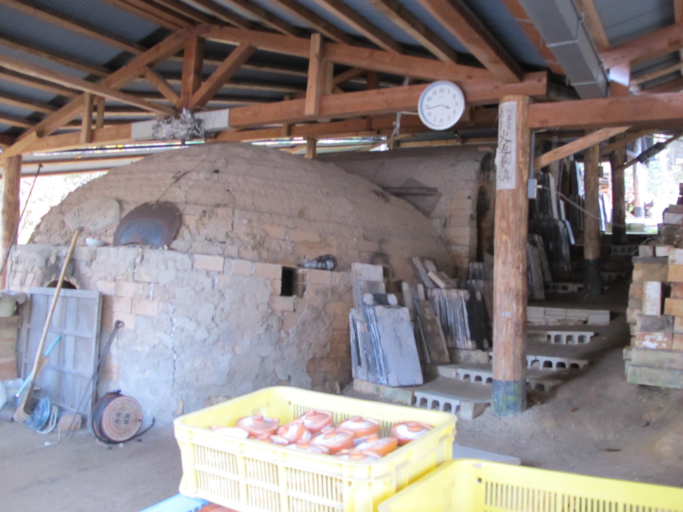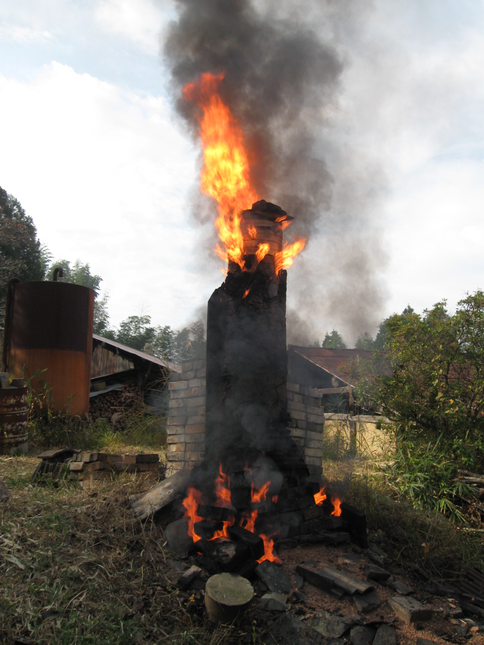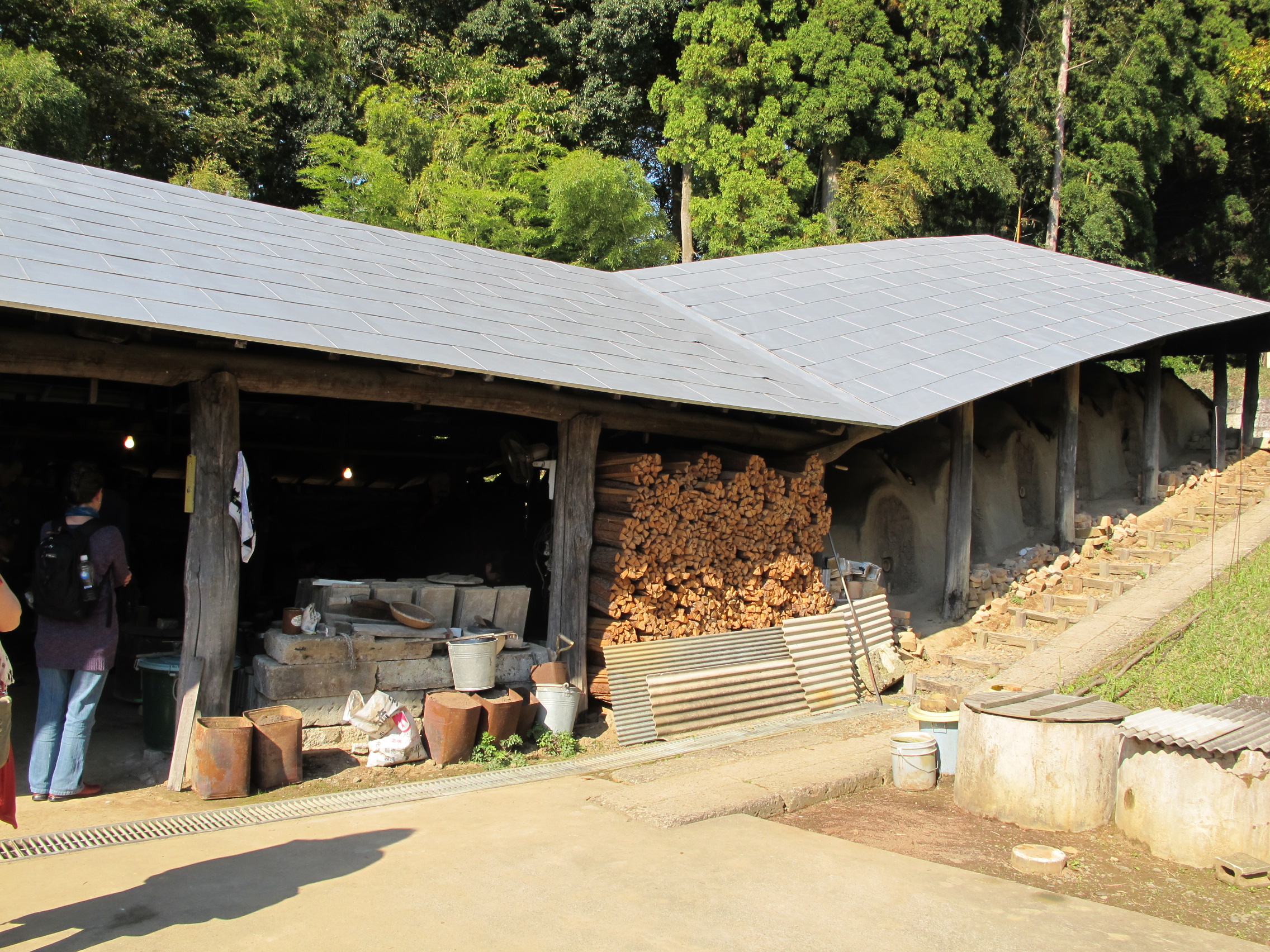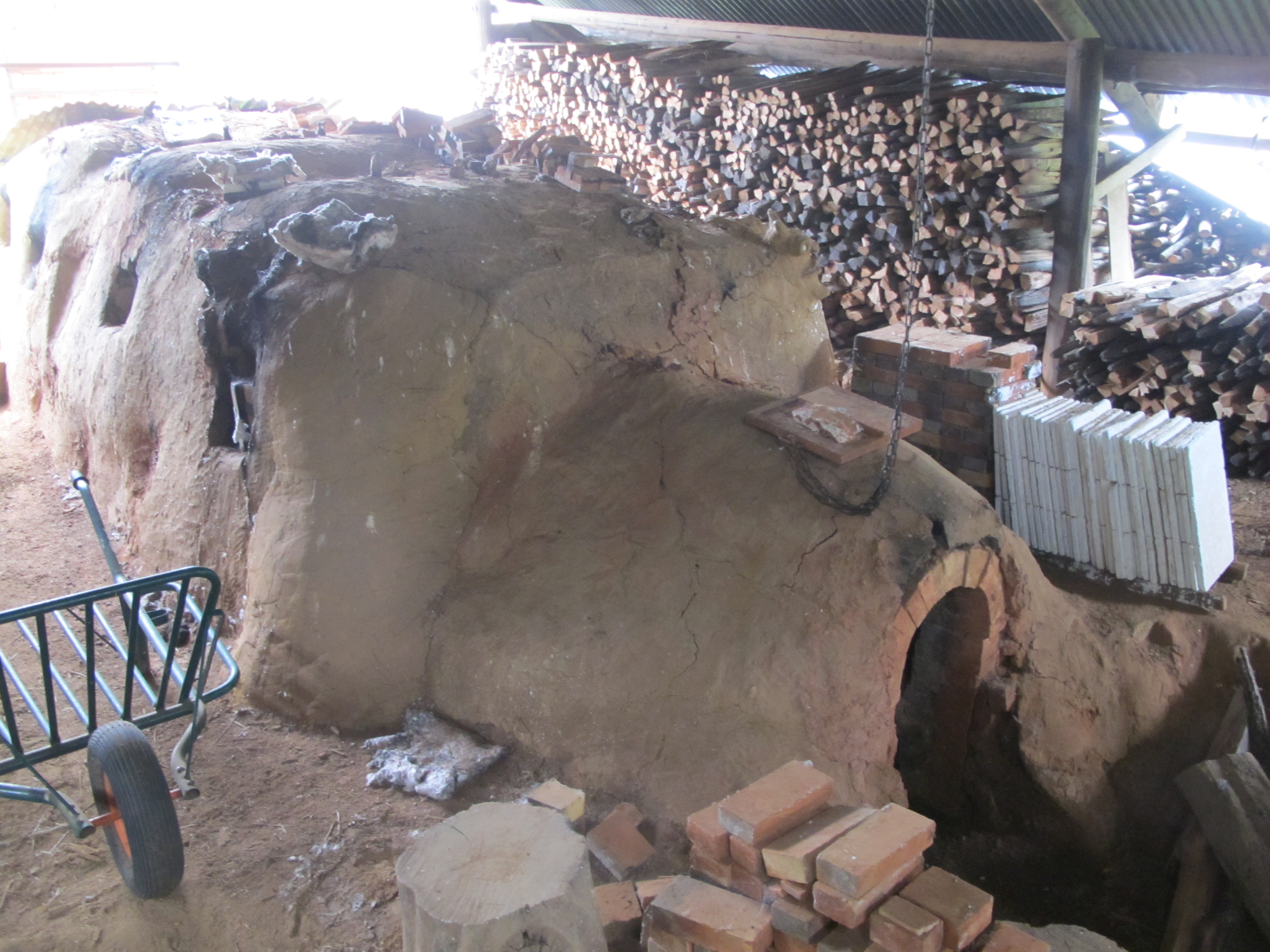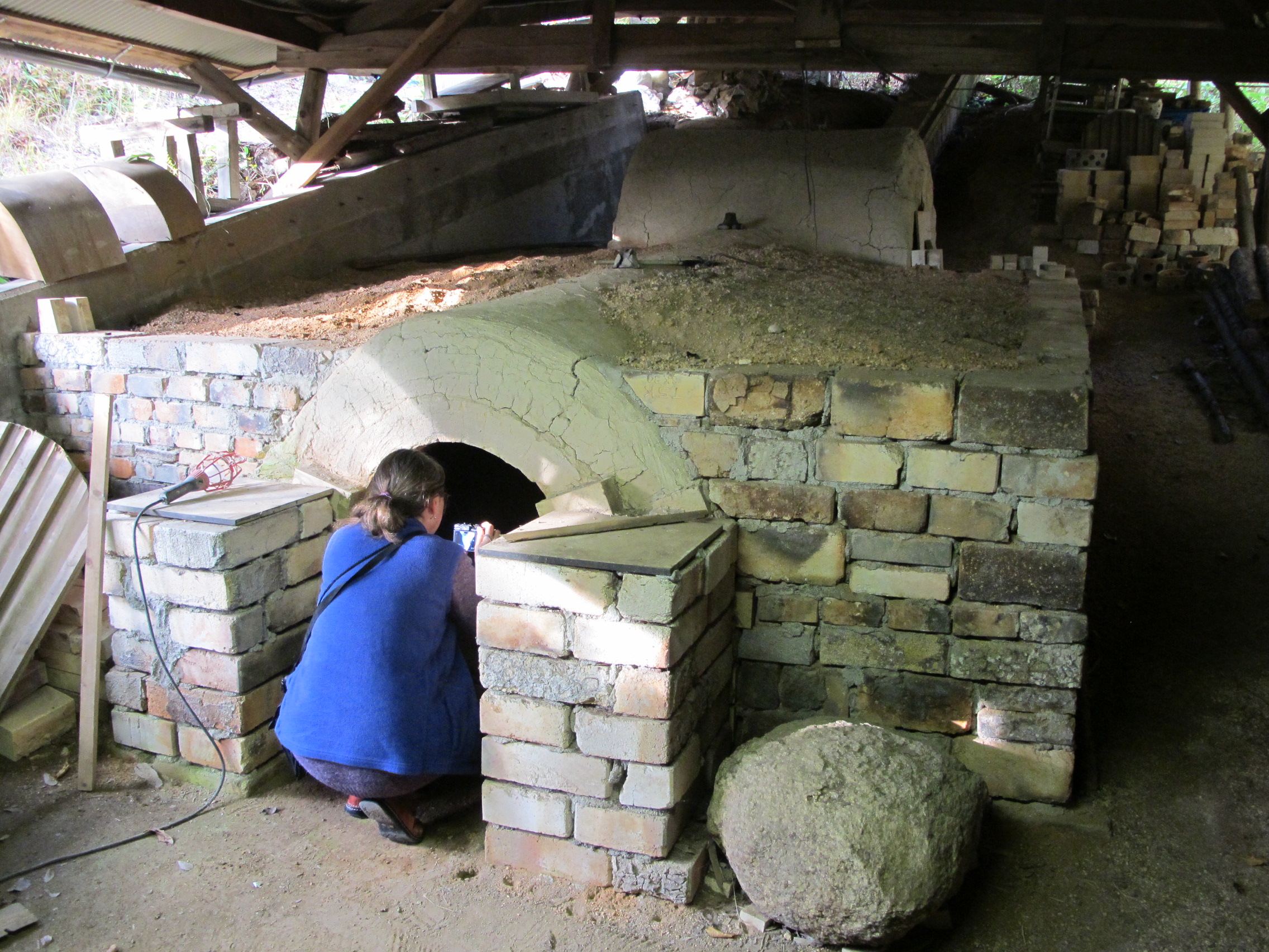 Wood fired for one month to steam off the 10,000 items packed inside it, then wood fired for another 4to 6 weeks to get it up to temperature of 1090oC. Then a month to cool, before unpacking and repacking. Only 4 firings per year, but they have 4 kilns.