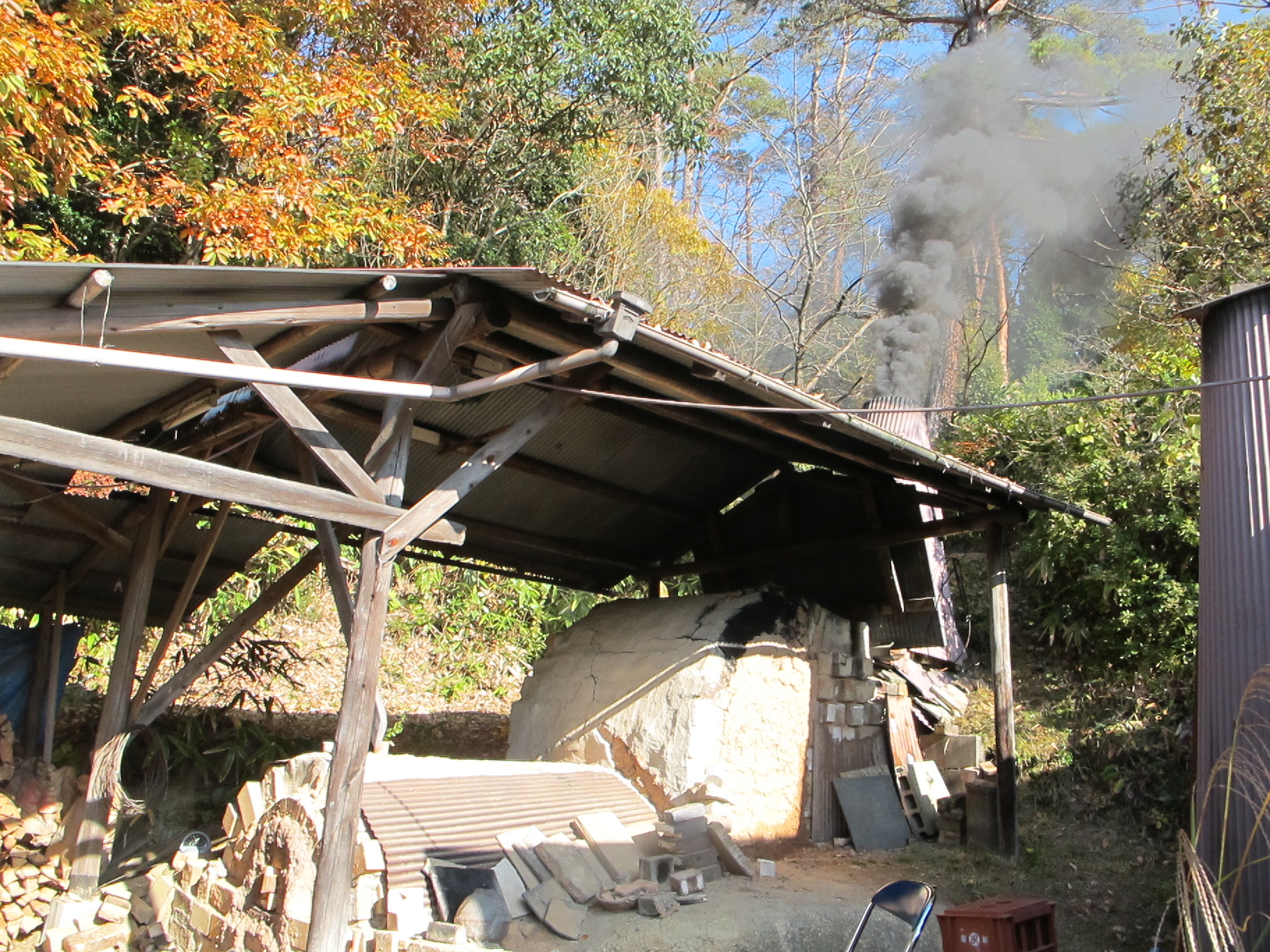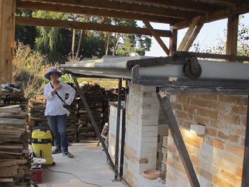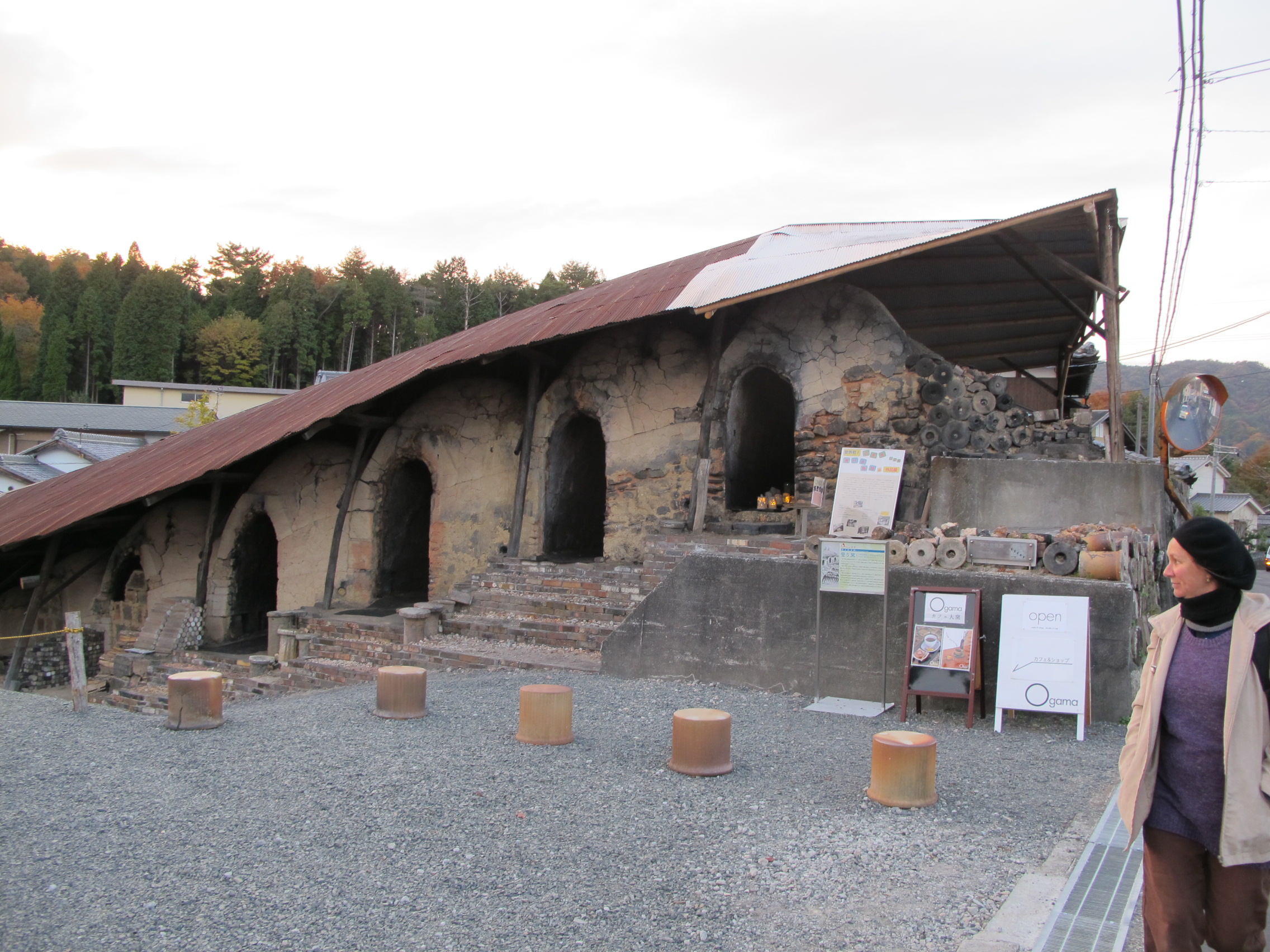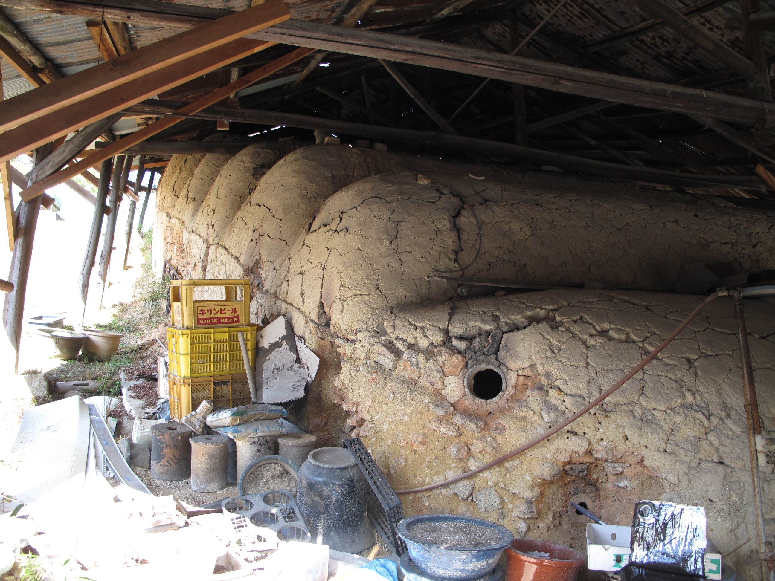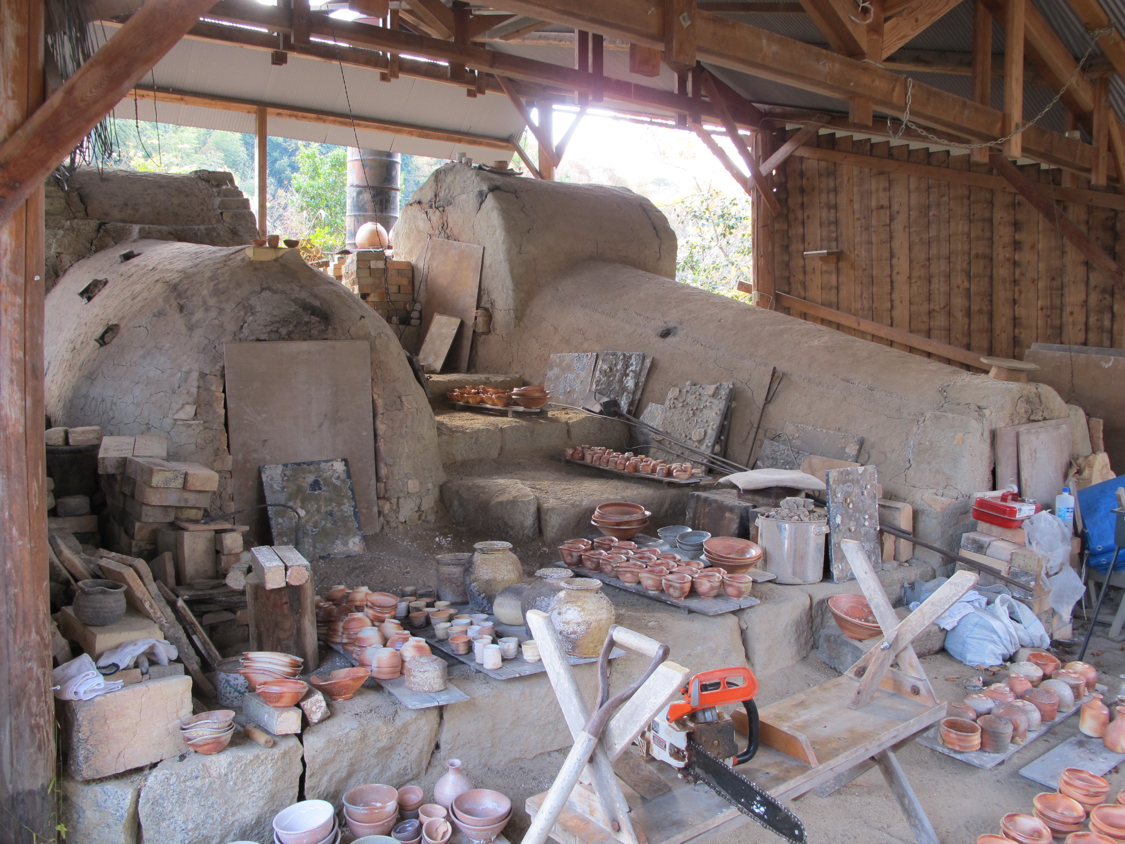 Wood fired for one month to steam off the 10,000 items packed inside it, then wood fired for another 4to 6 weeks to get it up to temperature of 1090oC. Then a month to cool, before unpacking and repacking. Only 4 firings per year, but they have 4 kilns.
