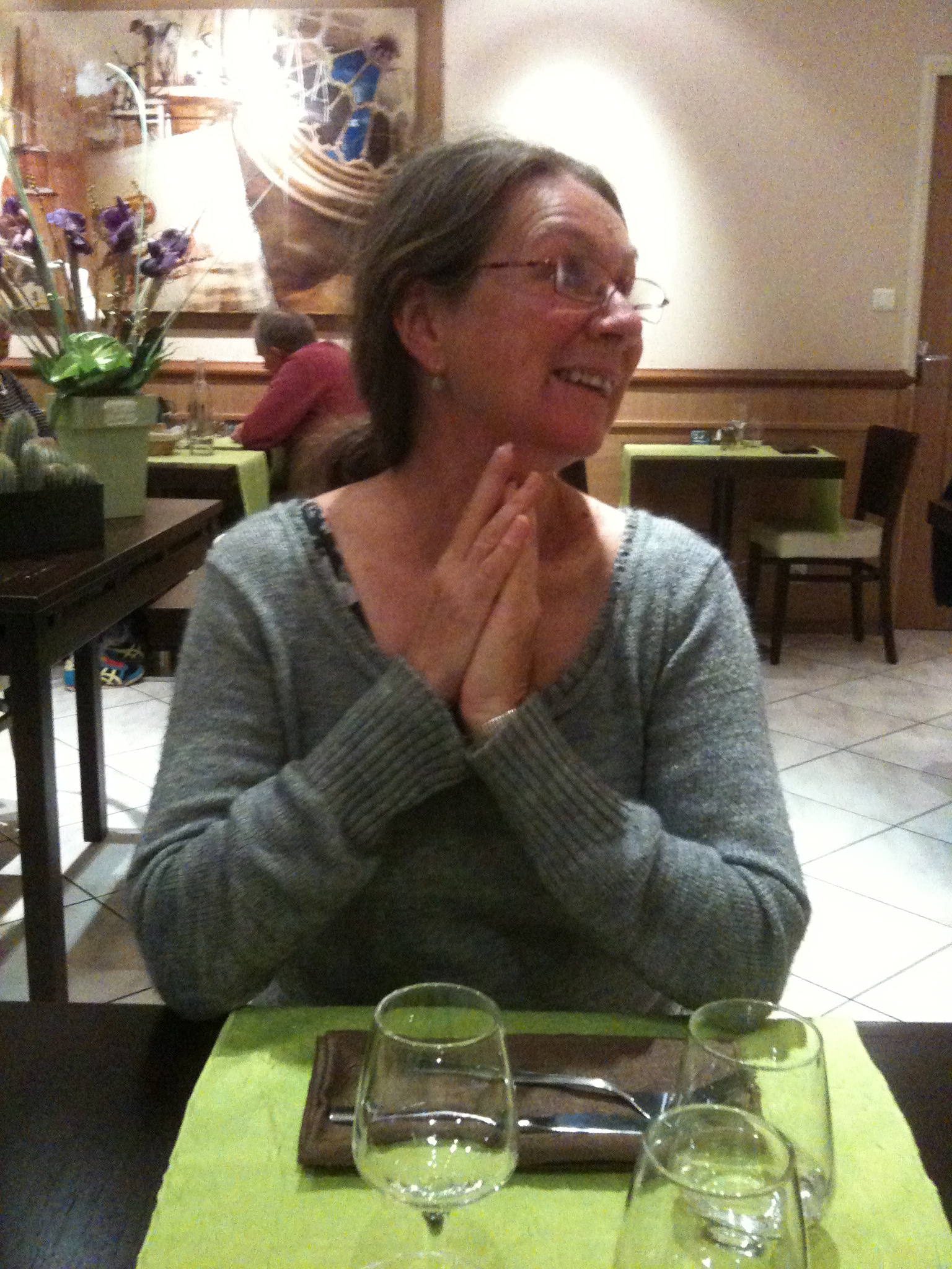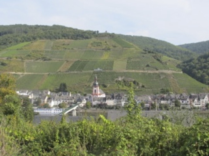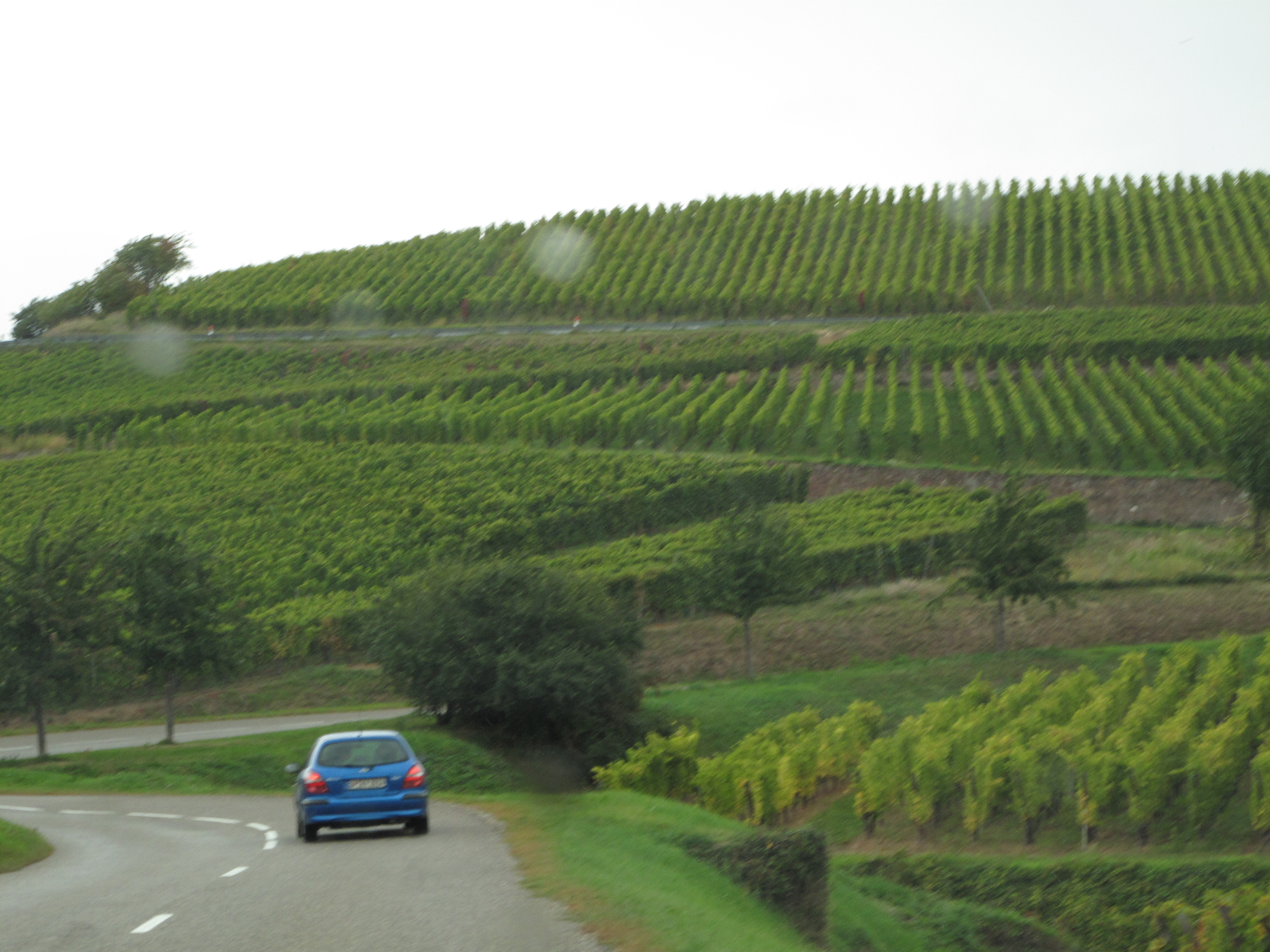 We travel all the way down the Moselle valley. It’s really beautiful. I love those high tiered vineyards, stacked up the steep hill sides along the river. It’s beautiful. But I can’t afford to drink any of it if I want to keep my wits about me whilst driving on the right. Everything is reversed – except the peddles – Thank goodness! I keep switching on the windscreen washers instead of the blinkers, and trying to change gears with the wrong hand. But we learn a lot about wine.