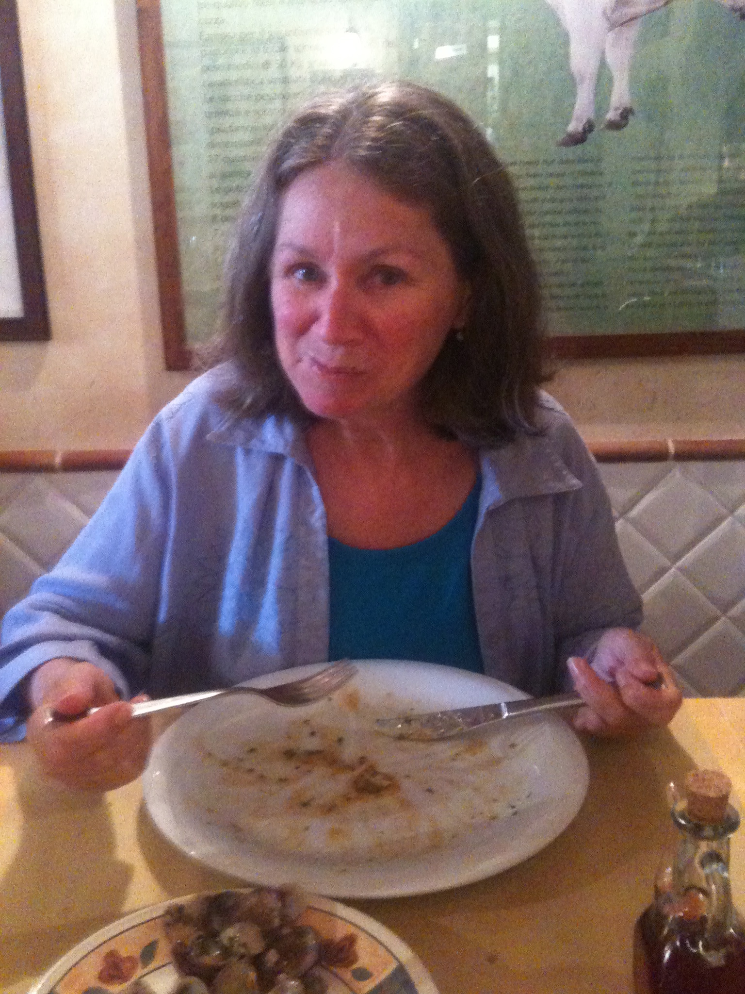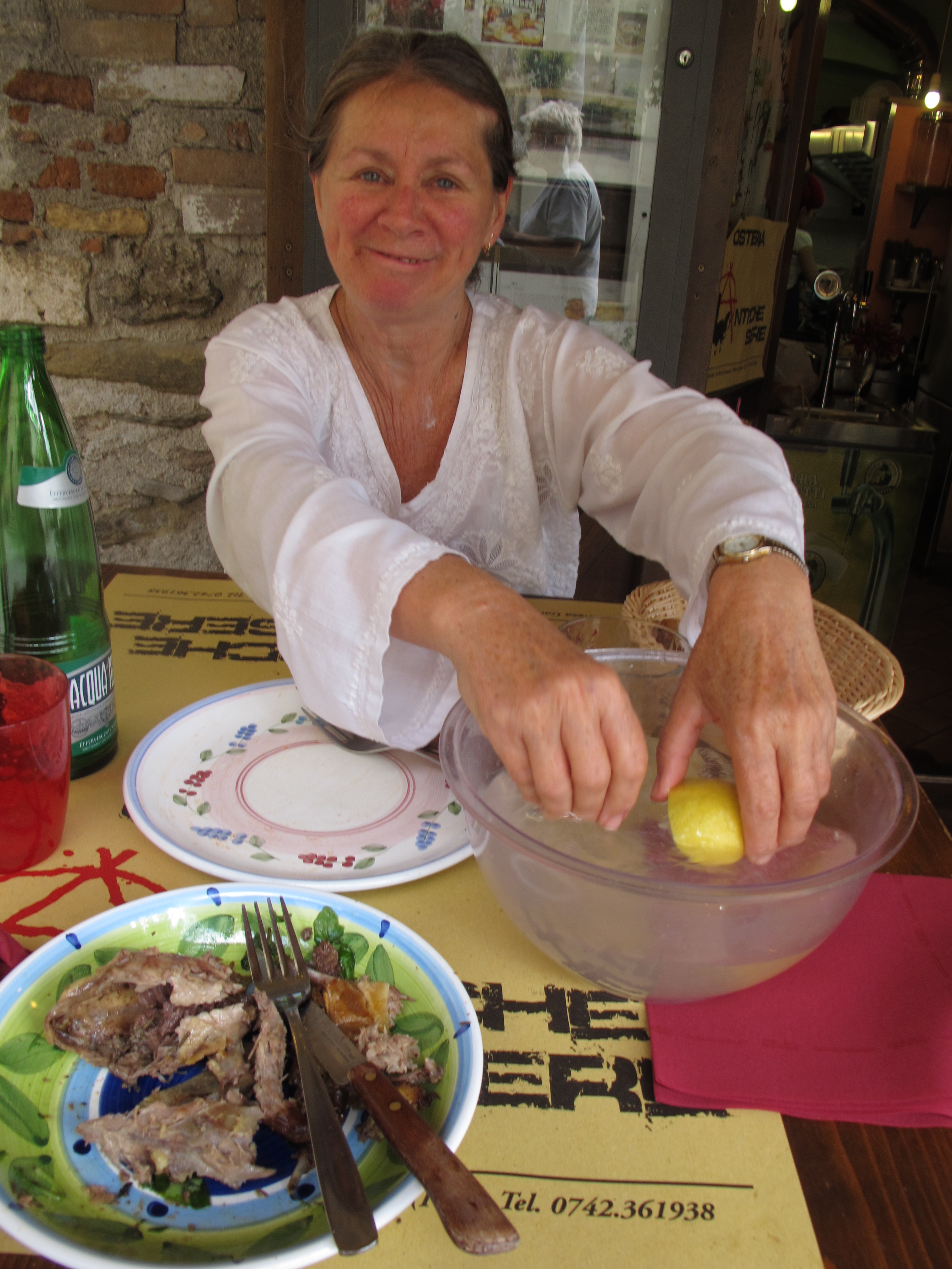 And it’s only the summer house! It was built in the 1600’s but only owned by this family since the 1800’s. I love it and would love to work here. It has a few suitable places for a pottery studio and a kiln, but there will be a lot of paperwork to fill out, as the building is a listed ancient building, and it will be difficult to get anything done officially within a decade or so. So it might just have to be done illegally, or should I say without the condo – initially! We spend some days here, and why not, it’s so beautiful. We make day trips in to the prosecco valley next door and another into Venice and another one up into the mountains for some walking. It’s a great place to work out from. In the next valley, not too far away by car, is where prosecco is grown and bottled, so we spend a day there. It’s a thriving industry here, sale are through the roof, and everywhere we go the winemakers are doubling their production and building new processing plant or doubling and and tripling their old buildings, even while the vintage is in full swing. There are tractors hauling big trailers piled high with their yellow/green sugary, sticky grape harvest, all along the narrow lanes. There are queues of these leviathans waiting at the winery, in line, along the dirt tracks that lead into them, all dug in tot the sides of the narrow valley, all clambering for some level ground to build and extend into and onto. The tractors are all queued, waiting their turn, back to the tarred main road. There is no room for us and we are turned back by a young guy, who is paid by the winery to stop tourists like us from entering the small dirt lane. They want our money, but can’t afford to interrupt the vintage. We are told by one of the locals that the place to eat around here, is a few kilometres away, up in the hills. Just go straight on for a while, then at the top of a hill and on a blind curve, there is a stone building!!! Yes,. Like every other bend in the road! Amazingly, just when we feel that we have gone too far and should turn back. There is a likely place, but it doesn’t look open. That’s because it all happens around the back, away from the road near the vineyard. This is where the locals eat, and what a treat. It’s full, but there is one table left for us. The menu is not written down at all, the girl just recites it to us. So I have forgotten most of it, but it is all local produce, cooked on-site in the small kitchen. There is a choice of several antipasti, we choose the porcini salad with salami. Thin slices of fresh porcini and crumbled chunks of parmigiano with a dressing of finely chopped parsley, lemon juice and olive oil. Fantastic!. We choose the local prosecco made by the owner of the restaurant. The primos are various pastas, I go for pasta with goose ragu, La Bella has the Gnocchi, but there are a few others to choose from. The secondi can be a traditional bean dish, Tripe – sheeps stomach, baked boar or venison, as well as some others that I can’t remember. We have the boar and venison. Finally we struggle to the dolcci, there are a few, but we choose Semi fredo and the almond tart – with a little grappa as a correctivo to help us to digest our weeks calories!