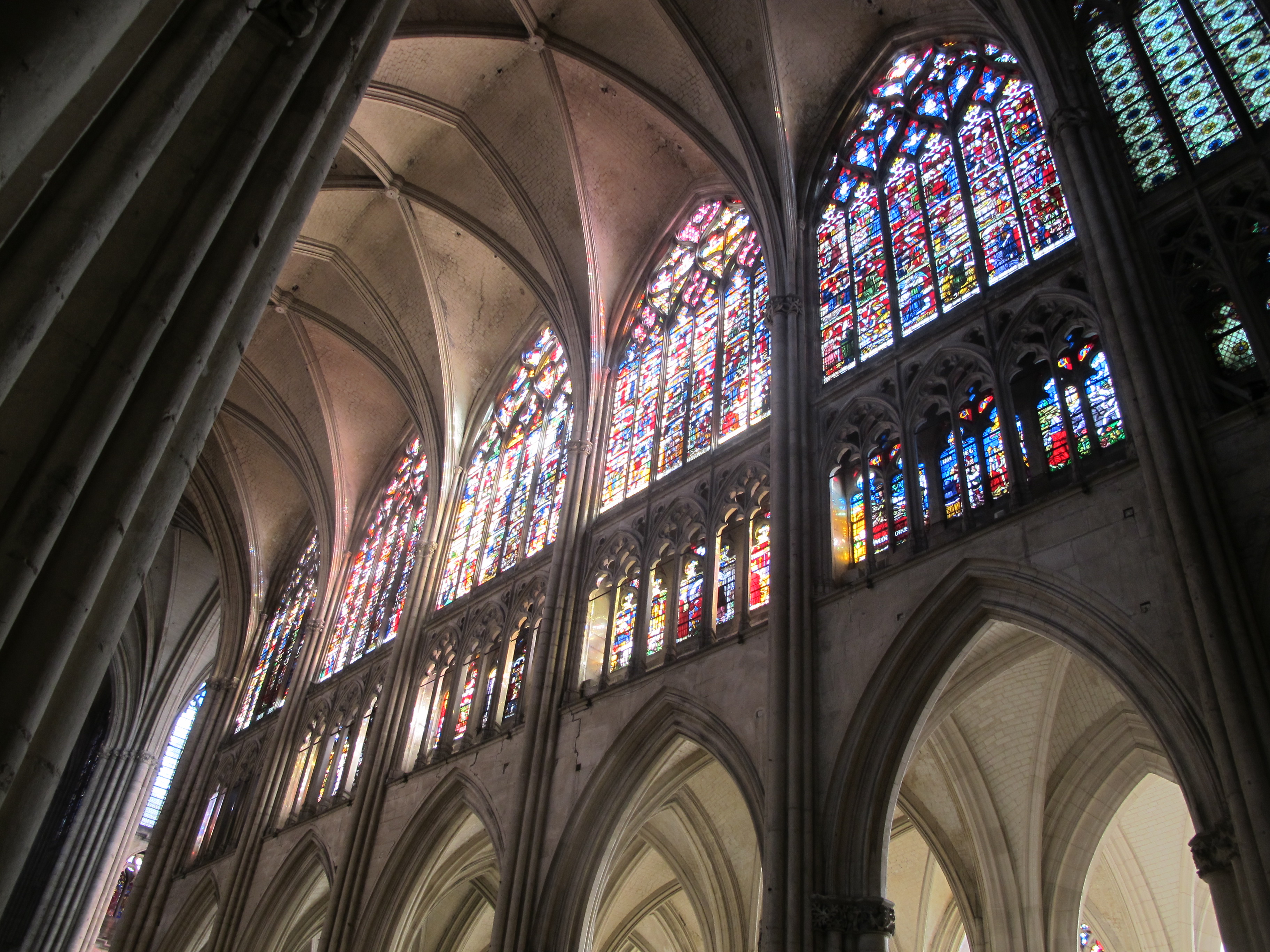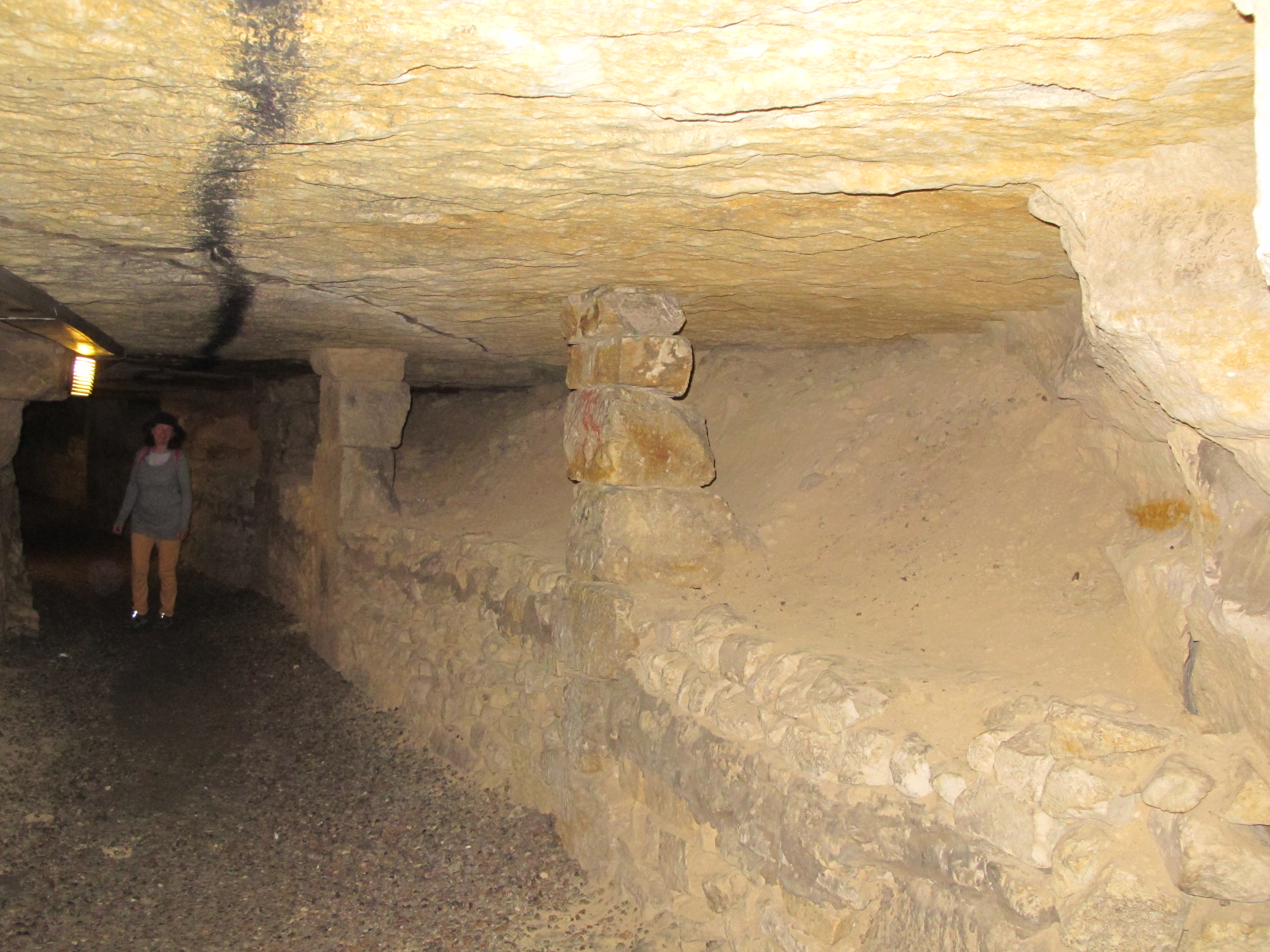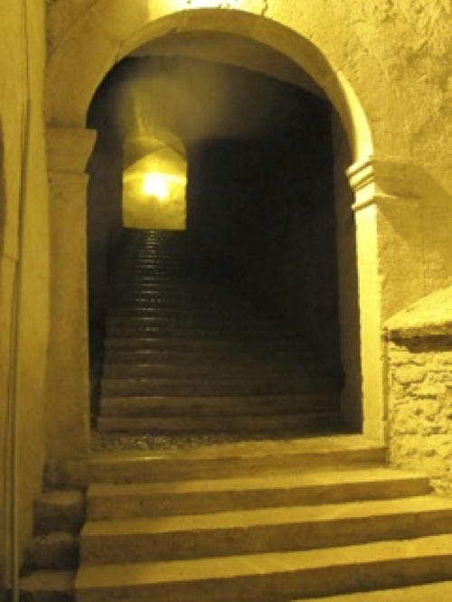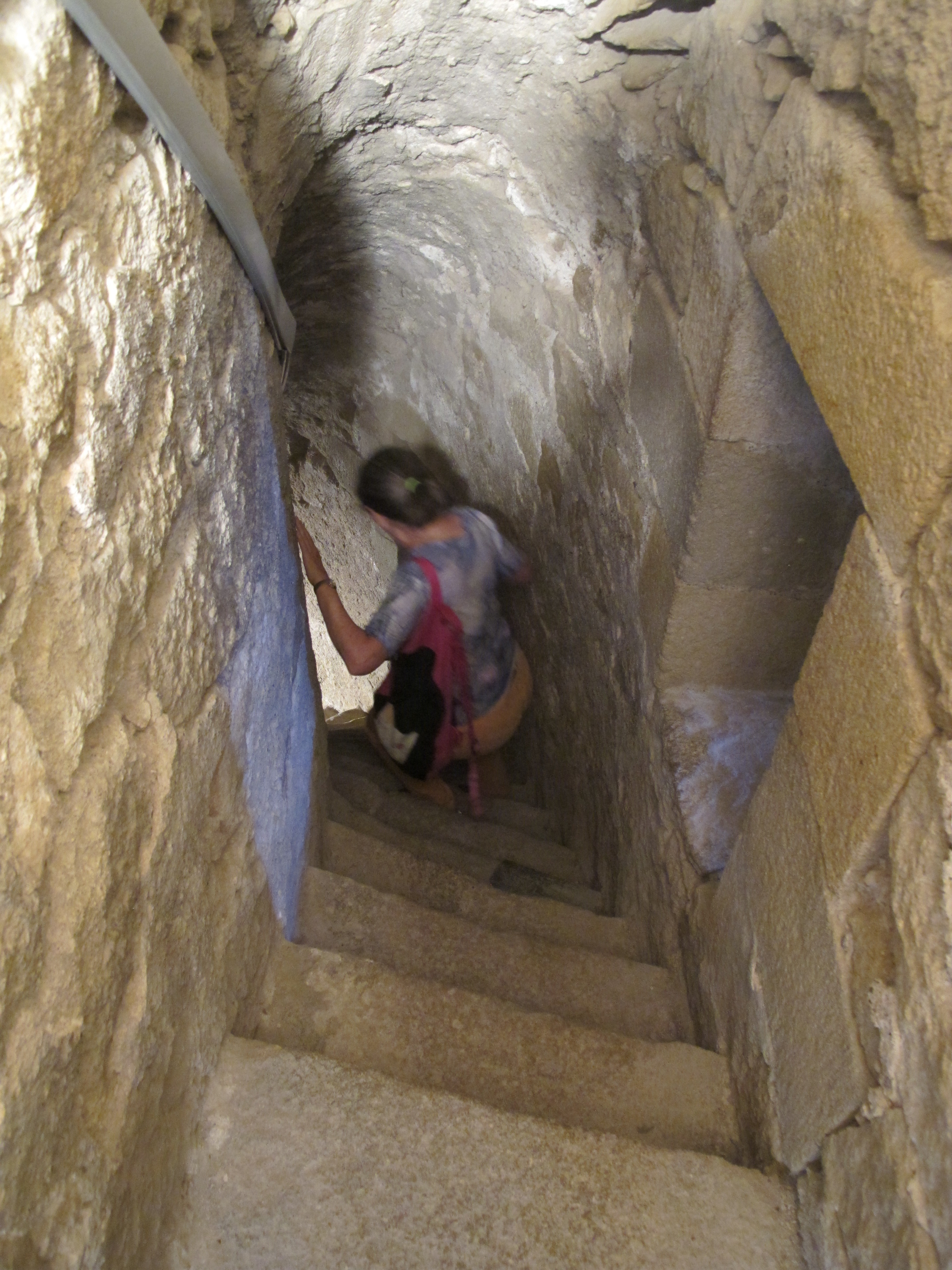 We have a room in a pension at the bottom of the hill, outside the town where it’s cheap. Janine wants to see the cathedral so we wander on up to have a look, It’s late in the afternoon now and there are dark clouds building. My hip is playing up, so I decide to sit in the apse and wait while Janine wanders around the old church and I see her disappear down a staircase into the crypt. I wait, and still I wait, she doesn’t come back up. I wait some more and rationalise that there must be another entrance or exit on the other side as well. I wait a while longer. After 15 mins or 20 mins. I feel that I have waited long enough, she hasn’t come back out, so I limp down to have a look. It’s at the opposite end of the church, and it is a very tiny crypt, as it turns out, just one small room and there is nothing much down here. Except maybe a portal to another dimension if you touch the right piece of ancient jutting stone, or say the correct incantations? I can’t understand where she could be for so long. I go back up into the church and wander around, I check out the cloisters and around the apse, into the car park, back into the church and walk all around. Back outside to the main entrance and steps where we came in. She’s nowhere to be found. I can’t make it out. It’s getting very dark now as the clouds close it and the storm is about to break. I have tried to ring her on her mobile, but strangely there is no reception up here in this part of the town. It’s spitting rain now and the clouds are rumbling. There is a flash of lightning. I do one last circumnavigation of the building and back down the isles, around the apse and out through the main entrance again. I can only think that she must have missed me somehow and decided to go back to the pension down in the town before it starts to rain too heavily. I look in the church once more and then limp, hobble and sort of run all the way back down the only street in the village, expecting to find her sheltering in a portico along the way. I finally get to the pension in the belting rain. I drip my way up to our room to find it empty. She isn’t here, nor is there any sign of her having been here. I close the open window that has allowed the pelting rain in. The carpet is soaked. I’ll deal with that later. I ask at the desk, No, she hans’t been in. I believe in science. There must be a rational explanation for all this. I run and hobble back up to the top again, my hip is killing me. Douglas Adams wrote in his Dirk Gently’s holistic detective agency books, that One must examine all the evidence, rationally and exclude all the obvious possibilities one by one. Then what is left is the only explanation. I decide that it must be the Portal in the Crypt! When I finally flow back into the church, soaking wet, breathless and steaming. There is Janine, pristine and pretty, but furious with me for not waiting where she left me. She’s only been an hour looking at the art works in that little side room off the cloister!