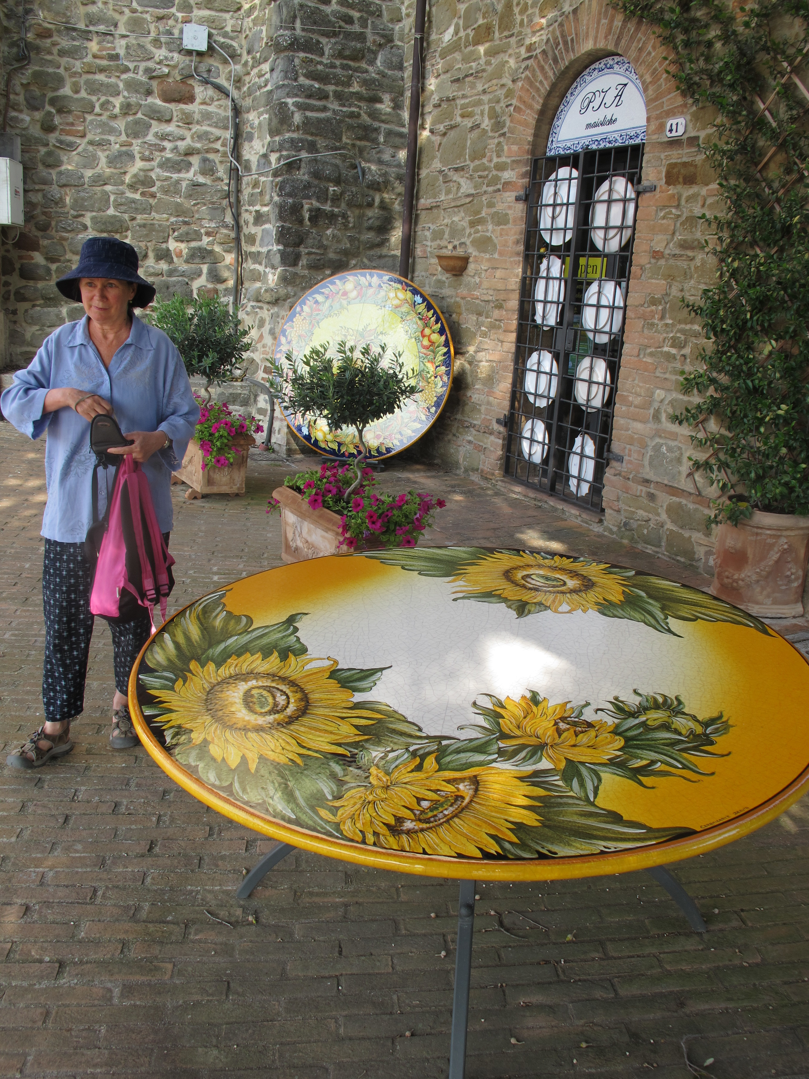 The olfactory compass of my intrepid partner, Janine King, directs me to take the road much less travelled from Chianciano across the blank part of the Umbrian map towards Spello to the north of Todi. This part of our map is blank and all it says is “There Be Dragons”. We decide to go anyway. Apparently it’s an old map! We find to our delight, empty little winding roads through all the usual vineyards and olive groves up into chestnut forest past small family sized saw mills and down again with tremendous views, into a small valley. We see that there is a tiny walled village ahead, so take that turn and park in the half empty parking area by the town’s stone perimeter wall, beside the arched entrance into this little gem of a place. It is 12.30 and seems like a good time and place to stop for lunch. The little main street/square is lovely and there are two cafes. They aren’t really ready yet as the girl is still placing the cutlery on the outside tables, all 5 of them! We are encouraged to sit at one of these 5 tables, in the shade of the awning and look at the one page hand written menu; Roast local rabbit, stuffed household pigeon, truffle omelette, baked egg plant, garden vegetables etc. We sit and consider. There is a small hill in the centre of the village and lots of little winding lanes full of very old buildings that show in their layered masonary facades, that they have been here for a very long time and have had their usefulness re-assigned many times. There are people wandering about, old ladies on their bicycles peddling home with their shopping. A tiny ape (motorbike truck) pulls up and a huge man unfolds himself from it. A hunter dressed in cams walks past carrying gun and a plastic carry bag with a pheasants tail sticking out. He hands it to the chef, the menu on the board is altered. We sit and observe. We are sitting by a stone arched covered stairway that leads up the hill, to where, we don’t know, but a lot of people are using it. I decide on the roasted pidgin and My Partner decides on the egg plant parmigiano with a bottle of water on the side. No wine for me, as I’m driving. The girl is surprised, everyone round here has wine and still drives! What’s wrong with you? Are you sick? As I’m from Australia, I’m not used to driving on the opposite side of the road, so am determined to be cautious. From the kitchen, there is a flurry, a squark and a little puff of feathers, the oven door slams shut. We sit and we sit, I can see straight into the small kitchen, just enough room for two in there, but there are three of them working in the narrow space. That waitress isn’t a waitress at all, she is juggling 3 saucepans on the front burners and two large stock pots on the back burners. She ladles out something from a huge ceramic jar near the door and comes out with a large bowl of what turns out to be olives, all local and preserved onsite of course, accompanied by crisply crunchy sourdough bread with a chewy centre, fresh from the oven an hour earlier. It is all delicious. At 1.00 She places the black board out in the square to announce that they are now officially open. The place soon fills and at 1.15 our dishes arrive. This is real food, not cooked until it is ordered. Beautiful, crisp, succulent, juicy, tender, and wonderfully fragrant with a few herbs and a garlic stuffing. On the menu the desert is listed as tart of ‘marmello fruit’. We discuss this. Is it a pie of Marmalade, ie citrus, as we would understand it. Or perhaps the marmello here is the spanish or Portugese interpretation of ‘marmalade’, being cooked quince. But No. Before our meals arrived I saw a beautiful big pie come out of the oven and left to sit and cool, just inside the kitchen door. It is dark red black fruit with a lattice of pastry over the top. Of course the ever inquisitive Mmslle must try it. It turns out to be red berries, a relation of black berry or perhaps currants? We are not sure, however, it is delicious. We finish with with a short black coffee and when the bill comes it lists only our main courses. I signal the waitress that there appears to be some mistake. We have had the full four courses, but only charged the 15 euros for the main course. She waves me away. It’s all in the one price. No-one would dare charge for an entre, desert or coffee in a small village like this! I’m in heaven. I announce that I’m not traveling any further on this trip, but will stop and live here instead, but my lovely partner, ‘The Voice of Reason’, convinces me otherwise. and rightly so! The wise one still has more in store for my art education, and that next thing is Spello. All those years preparing classes in Cultural Productions and Art History have finally paid off. The main course concludes with a warm water and lemon finger bowl, so that we will not be intimidated in picking up the pidgeon and sucking every last morsel off the bones. But wait, I’m getting ahead of myself. This is not where it all started. We need to start at the beginning.